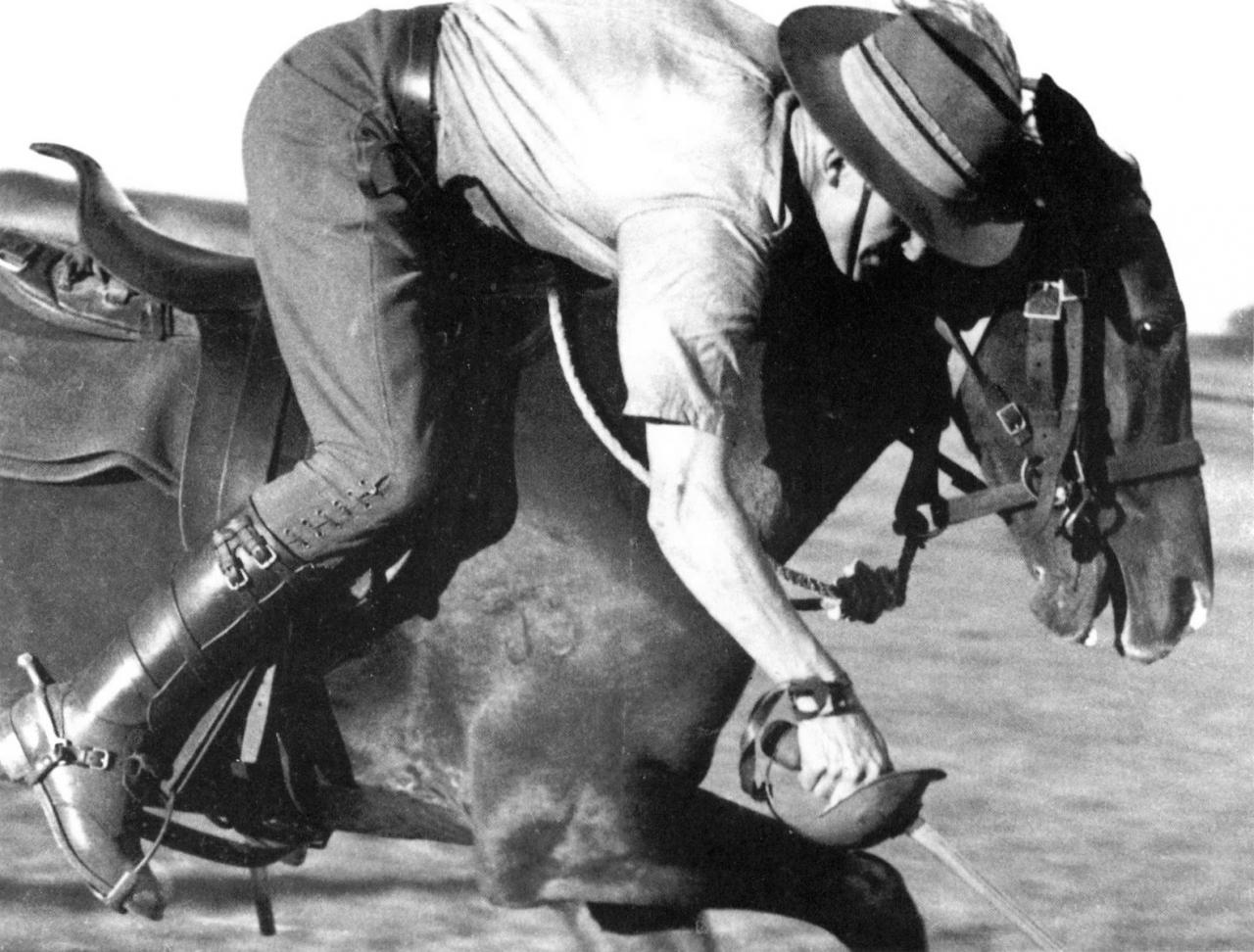 Camden, New South Wales (fig. 1) was taken by Geoffrey Collings in 1934 and is his earliest surviving photograph. It is a dramatically cropped image of a light horseman in full flight, tent-pegging as he leans over his horse. Collings’s interest in the graphic tonal possibilities of black and white photography is evident in the contrast between the silvery-grey colour of the man’s shirt against the dark, sweating flanks of the horse and the shiny leather straps. It is also a study of movement – freezing the aggressive motions of horse and rider mid-stride in a tightly composed format.