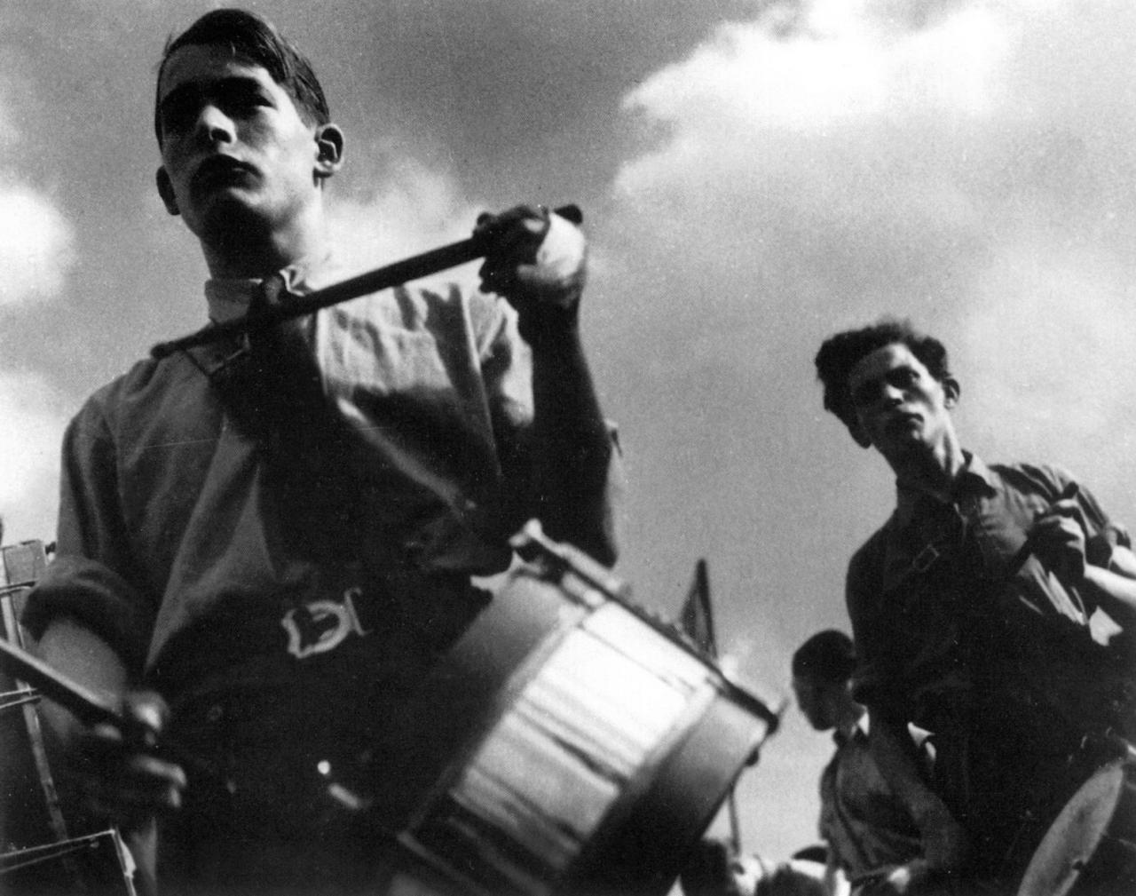 It was most probably his experiences in Spain which inspired the photograph Hyde Park Corner, London 1936 (fig. 4), which shows members of the Young Communist League at a rally. Its upward, dynamic viewpoint gives a heroic inflection to the marching drummers.