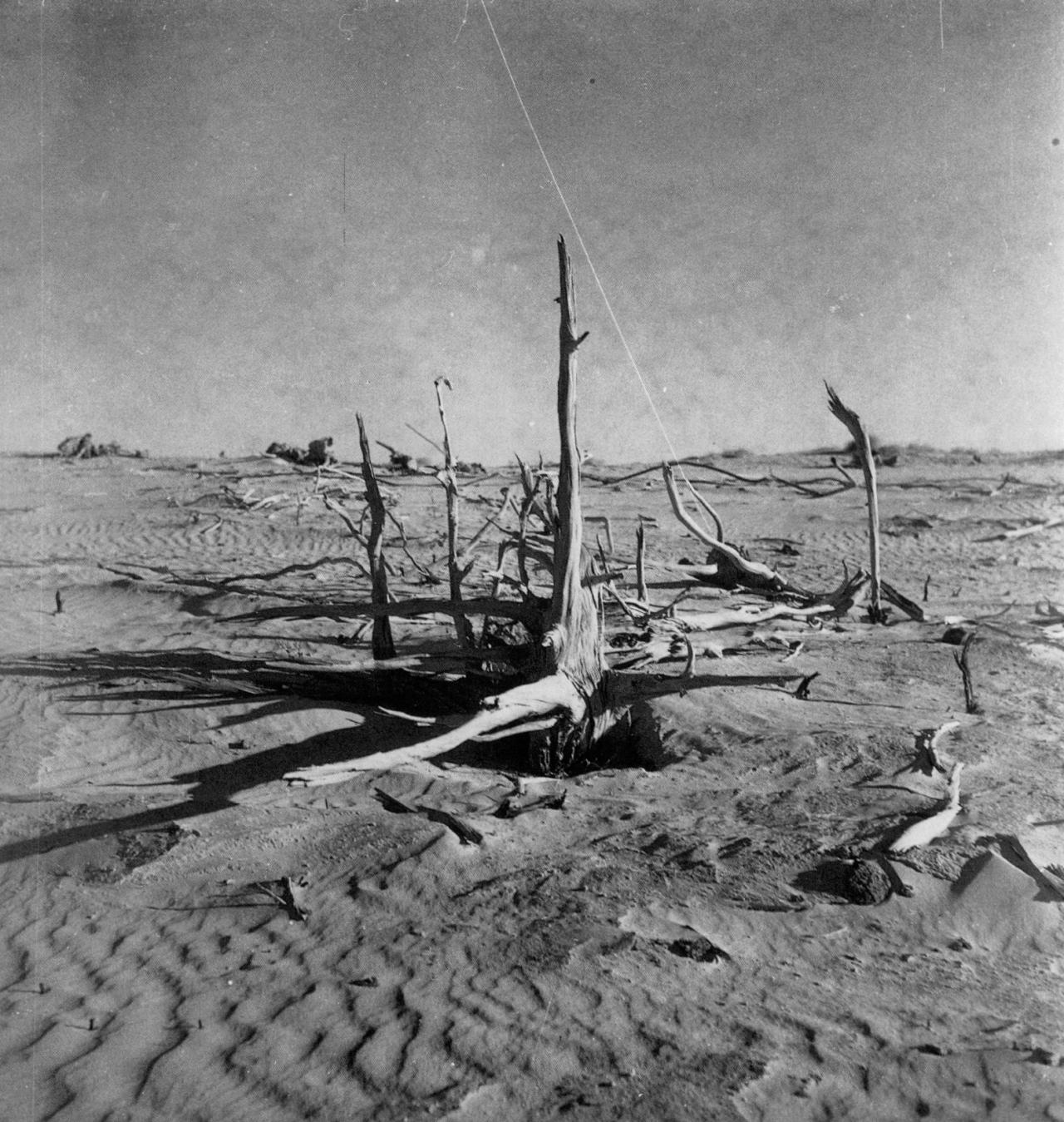 The then commonly held belief in the power of the photograph as an objective recorder of reality is mediated in images such as Eroded Mallee Country where the photographer clearly made a range of decisions regarding the subject chosen, the angle of shadows (which accentuate the stark, denuded mallee root) and even the text which accompanies, and affects, our reading of the image. The salutory full title for the work is They cleared the Mallee, planted wheat, a few good years and the topsoil blew away.
