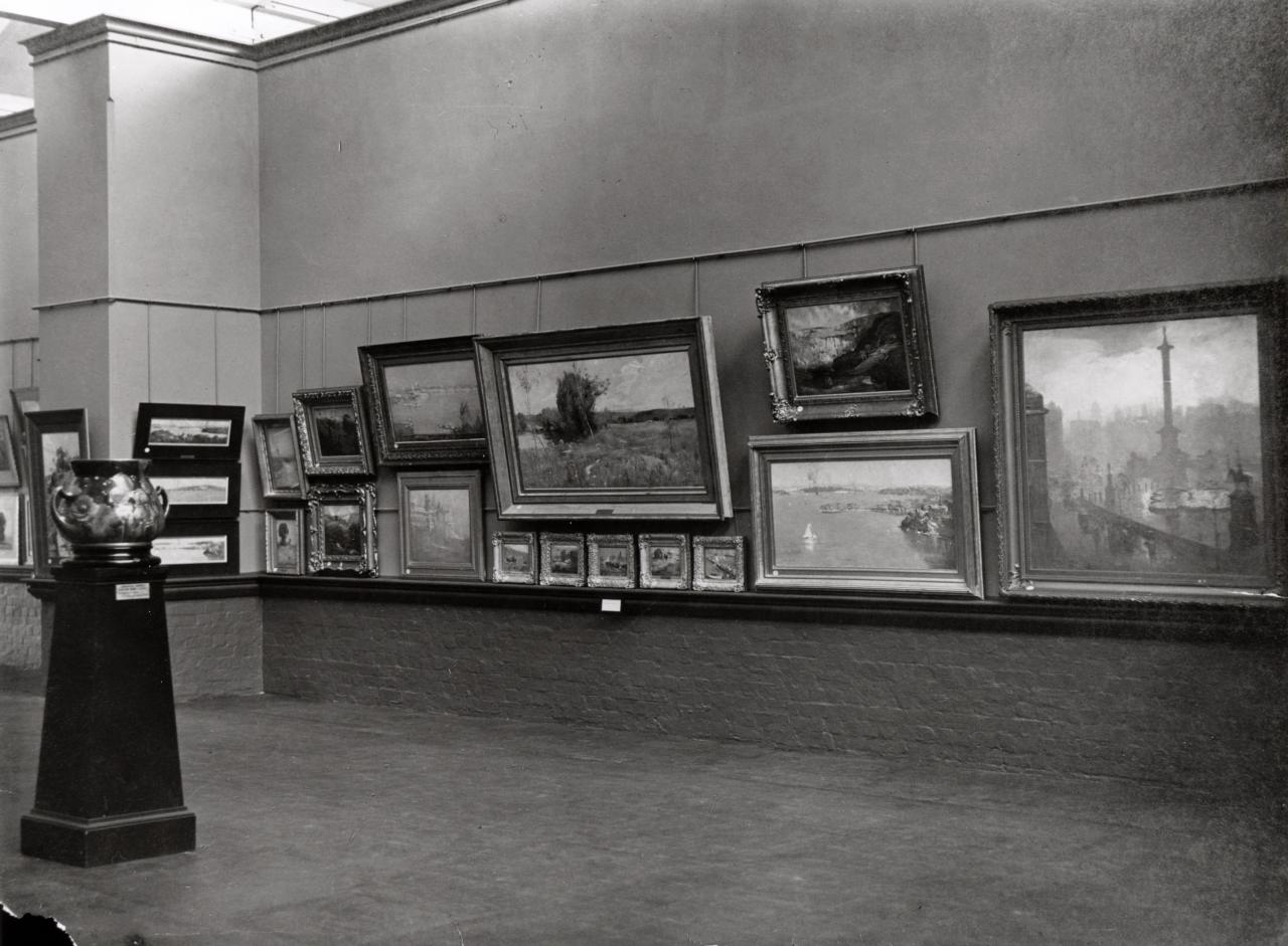 An intriguing old photograph inspired the re-presentation of Arthur Streeton’s major work Spring, dated 1890. The photograph shows part of the 1916 exhibition of the Baldwin Spencer collection at the Art Gallery of New South Wales (AGNSW). Spencer’s collection included works by many respected artists of the time including E. P. Fox, Frederick McCubbin, George Lambert, Hans Heysen, Charles Conder, Tom Roberts and Arthur Streeton.