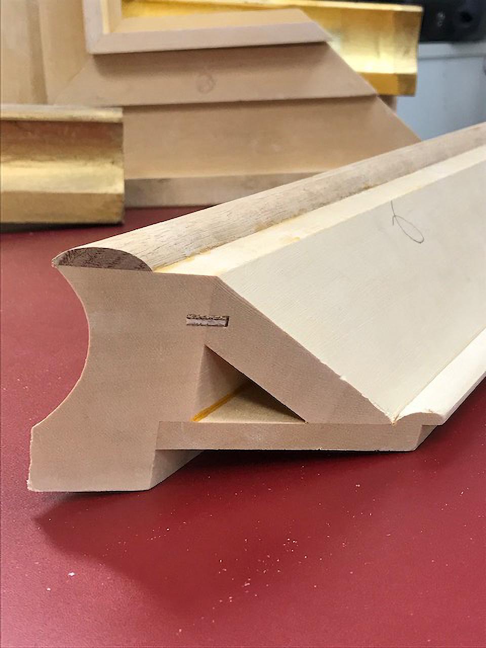 Using the scale drawings from the photographs, timber prototypes were made to finalize the details of angles, shapes and sizes of the sections that combine to create the profile. The prototypes were also used for testing the type of gilded finish to be applied to the frame.