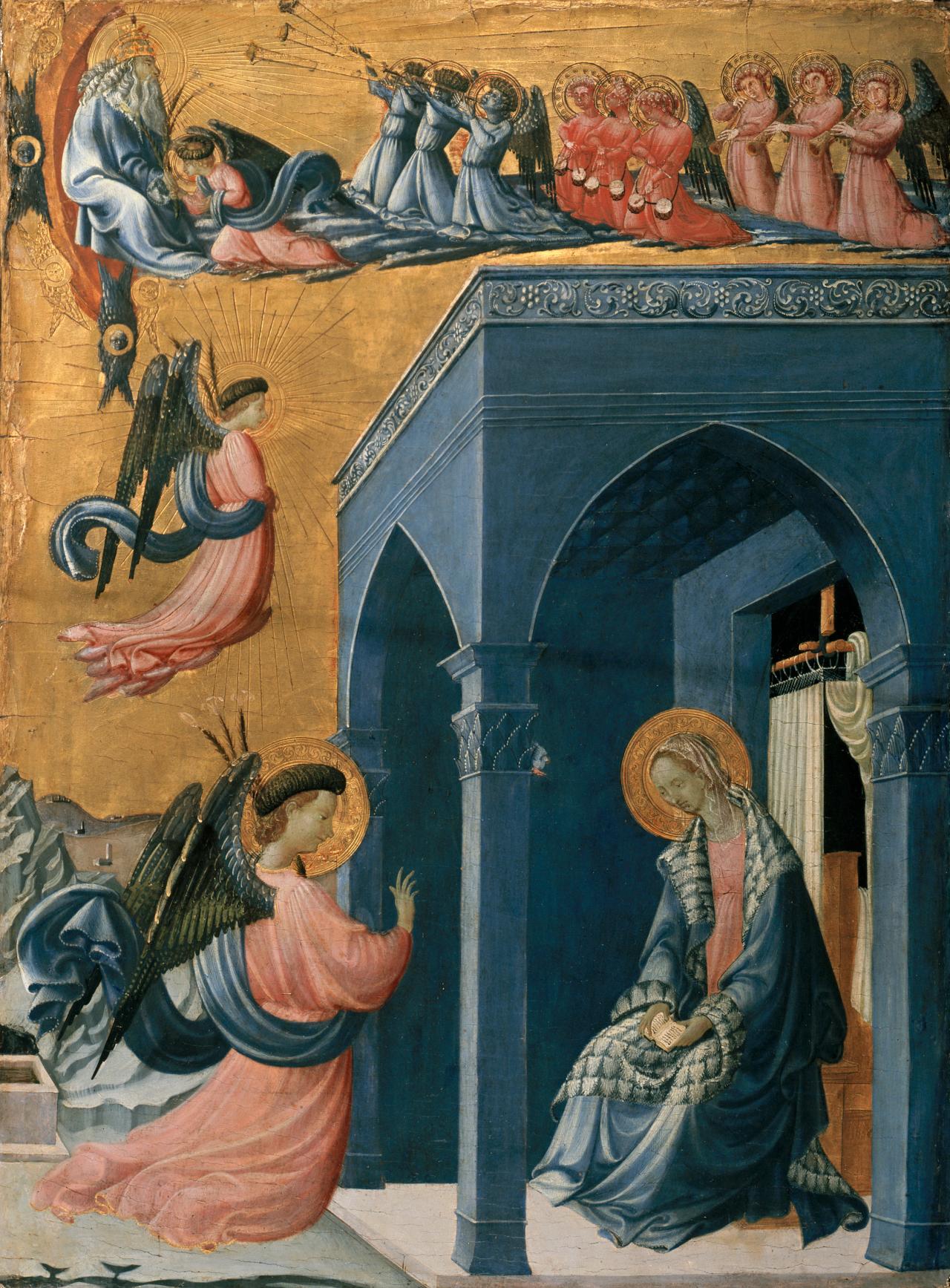 There are other minor differences between the works. In the Annunciation the facial features are predominantly modelled softly, in red-brown tones, while in the Saint George graphic strokes of black define the upper eyelashes, the irises and pupils of the eyes and the lines between the lips, closer to Fra Angelico’s style in such works as the Fiesole predella in the National Gallery, London. Conversely, the pastel colours of some of the Angels’ robes in the Annunciation are close to Fra Angelico’s delicate palette, while the strongly contrasting colours of the Saint George are characteristic of Uccello’s sometimes wonderfully unorthodox palette.