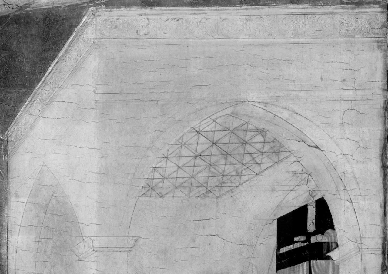 Perhaps the most interesting aspect of the design stage in the Annunciation is the geometric construction of perspective in the architecture, an aspect of painting with which Uccello is synonymous. It seems that the artist drew an approximate foreshortened square in perspective for the ceiling of the portico, drew diagonals between the corners of the ceiling to find the middle of the square and then, after many attempts, divided the square into a grid to provide the basis of the decoration of the pyramid-shaped points. The final grid is based on eight rows of squares by eight rows, while only those visible through the pointed arch were actually drawn and incised. In the underdrawing for the cornice around the freestanding pillar, separated from the capital by a block, the artist first determined the position of the four corners of the pillar, including the corner which is not visible (approximately), he then drew two diagonals between these corners to establish the correct angle for the corners of the cornice as they extend beyond the pillar. Having worked out the final version of the cornice he then extended the principal lines to the left so that the cornice of the far pillar would be correctly aligned. He also extended construction lines to align their capitals (figs 5 & 8). Of this fairly extensively underdrawn perspective construction, many lines do not appear in the X-radiography or as incisions on the paint surface. Thus, the artist generally incised, or incised more strongly, those lines that he intended to be visible in the final composition.