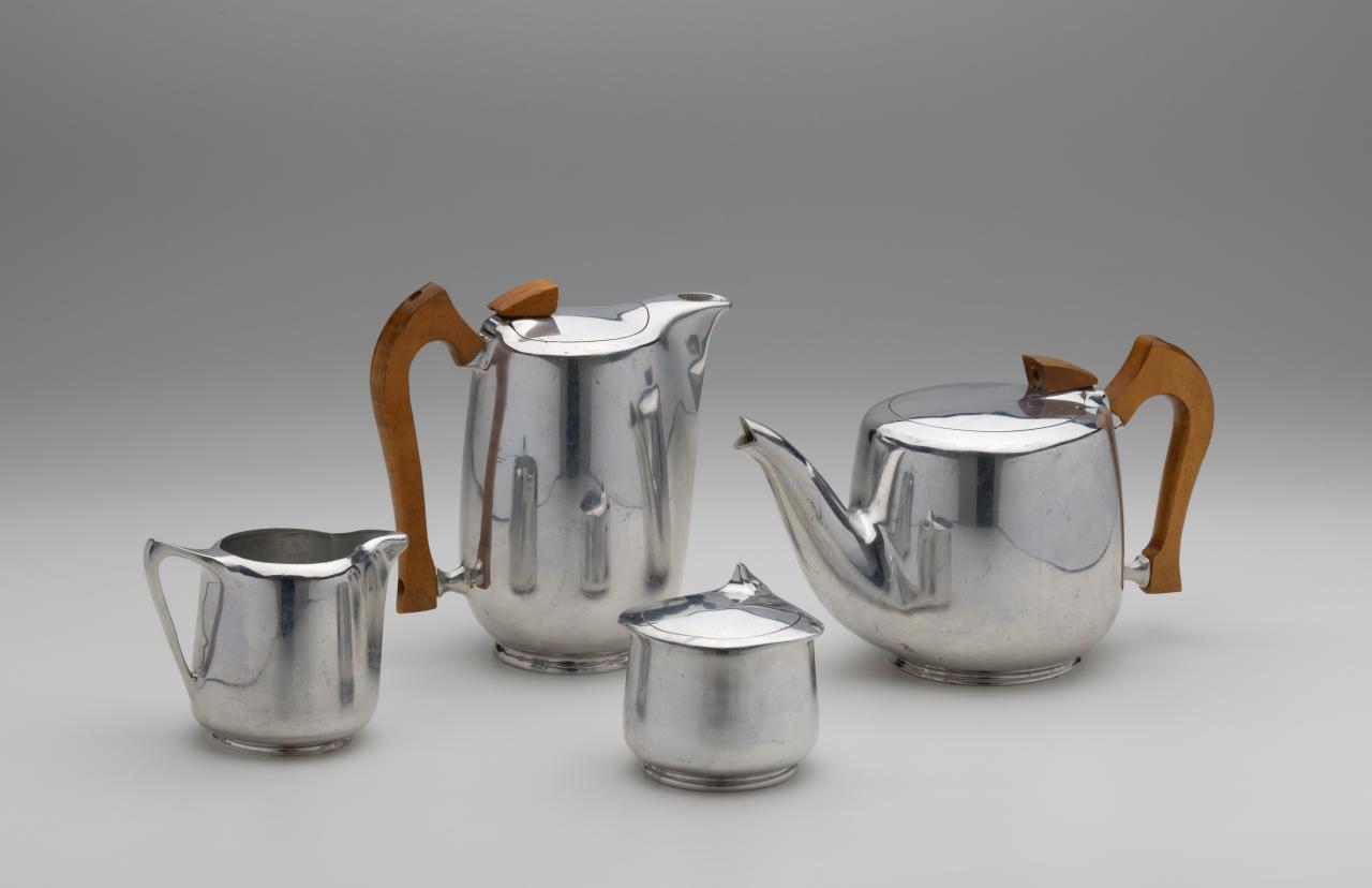Although developments in the design of domestic objects came to a standstill during the Second World War, wartime advances in materials and production technologies were quickly harnessed by designers and manufacturers in the postwar period for the creation of new consumer products. Plastics, moulded wood, and new metal alloys – including aluminium, enamelled steel and stainless steel – were key areas of innovation. Although first created in the nineteenth century, it was wartime innovations that allowed stainless steel, a low carbon, high chromium alloy, to find its place in the modern home where its low maintenance robustness and corrosion resistant, easy-to-clean appearance allowed it to supplant silver as the metal of preference for cutlery and food presentation. Plastics too revolutionised twentieth-century domestic design. Great developments had taken place in plastics during the war years, and the use of this material as a vital resource within the war effort helped to promote it. North American and European manufacturers began to employ leading designers to exploit the aesthetic possibilities of plastics in the design of affordable homewares for the postwar market. The 1960s saw plastics emerge as the ideal material with which to represent the key themes of Pop culture. They embodied a commitment to the future and technology, were flexible and expendable, and were highly suited to bright colours and the application of surface patterns.