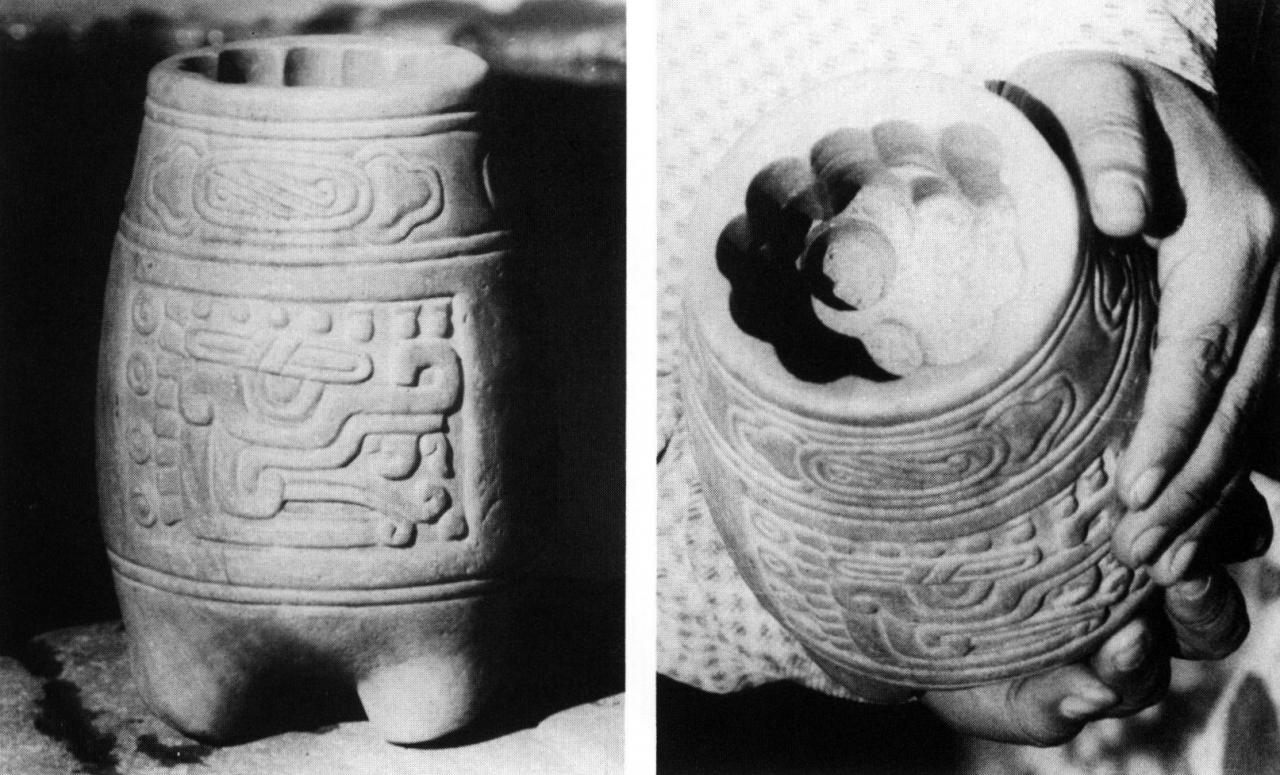 Without the aid of metal tools it must have been laborious to carve the vase. The inside was hollowed out by means of a tubular drill, probably of bamboo, and abrasives such as sand with water. The various drill cores were then broken off and the inner wall smoothed. This method is evident in a marble vase from Oaxaca, in which the exterior relief decoration had been carefully finished before attempting to drill out the inside. For some reason this procedure was not completed and the drill marks are clearly visible (fig. 2).