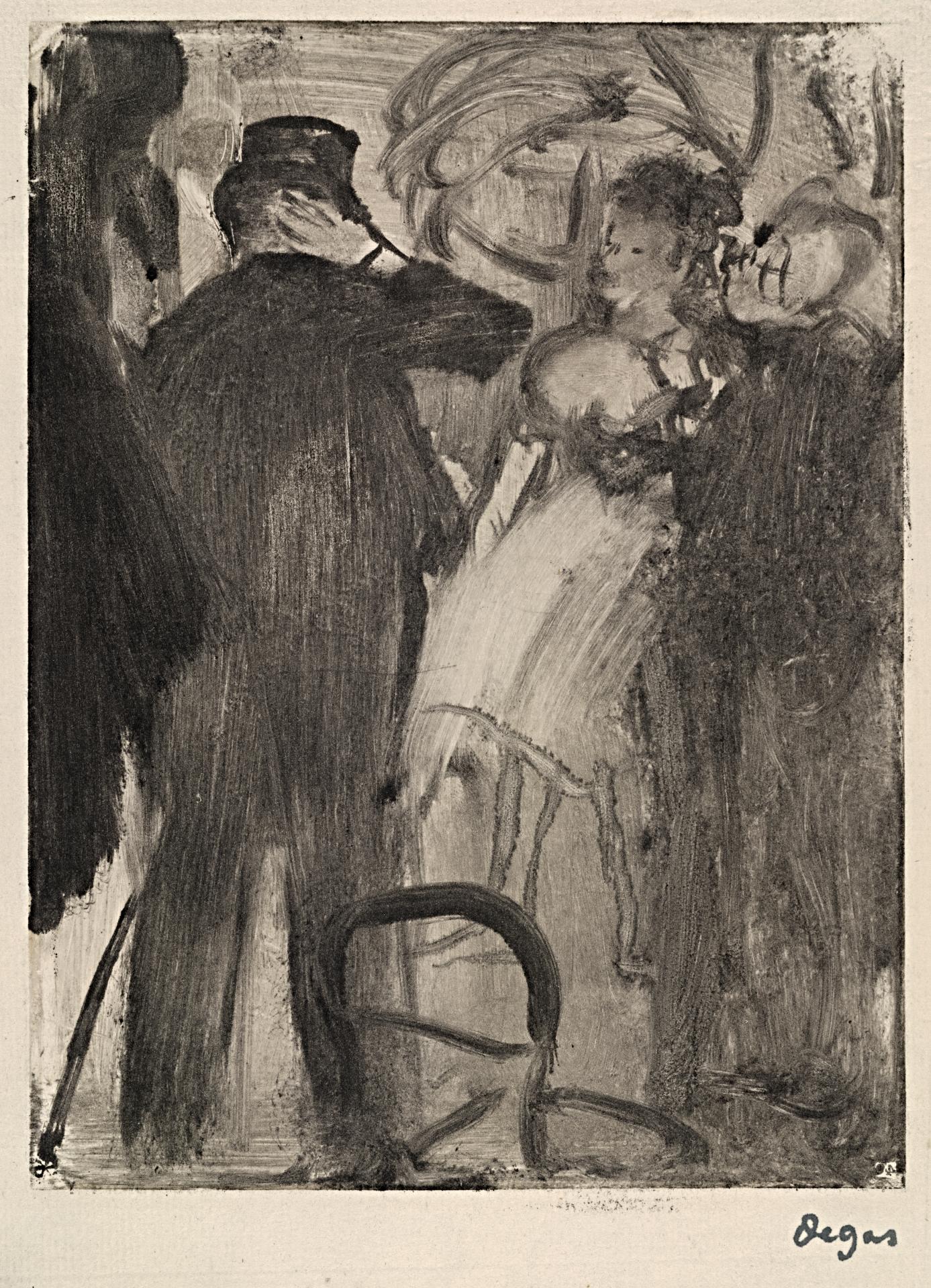Madame Cardinal scolding an admirer is one of a series of monotypes made c.1880–83 to illustrate Ludovic Halévy’s novel La Famille Cardinal which describes events in the life of the Cardinal family whose daughters, Virginie and Pauline, are ballet dancers at the Opéra.