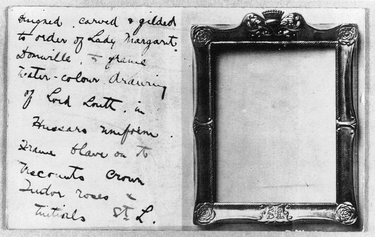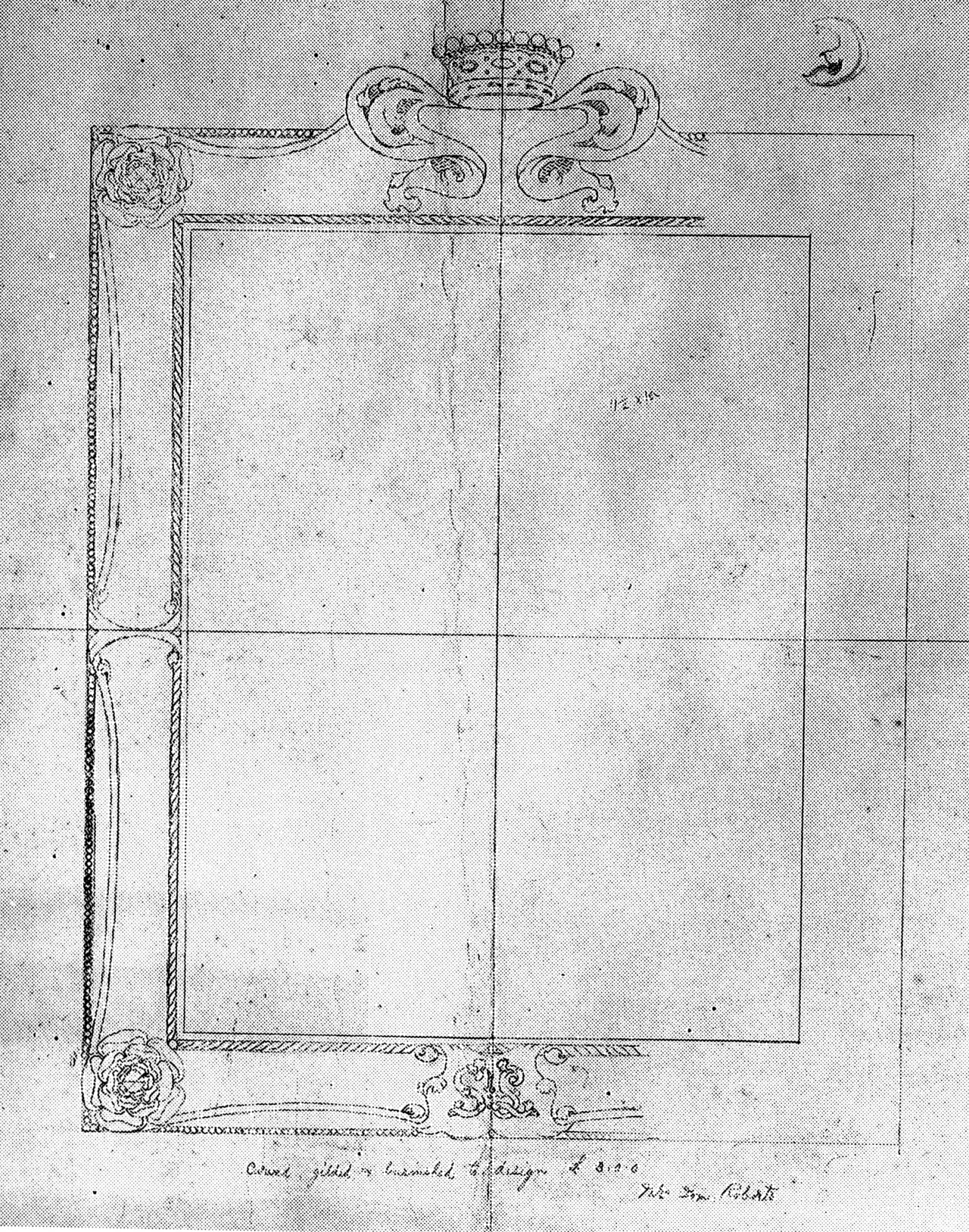 Mme Hartl is still in its original frame (fig. 7), the only extant frame by Williamson that carries her signature. The frame, a rough pencil sketch for which appears in a Williamson sketchbook in private hands (fig. 8), is deeply carved and swept to the midpoint of its sections, which meet in a ‘clasp’ of carved ornamentation. Carved perforations at the midpoint of the lower transection give weight and balance both to the frame and to the portrait it houses. In this instance, Williamson’s frame appears to have been commissioned not by Roberts but by his sitter. In a letter of 28 October 1910 to her sister Lucy Simpson, Williamson relates that Mme Hartl paid ten pounds for her frame.39Lillie Williamson, letter to Lucy Simpson, 28 October 1910 (family papers, Melbourne). At least one other Williamson frame appears to have been commissioned by a private individual. A note in Williamson’s hand on the verso of a photograph (fig. 9) (National Gallery of Victoria) of a completed frame reveals that Lady Margaret ?Downville had requested the frame for a watercolour drawing of Lord Louth. Extant drawings for this carved, gilded and burnished frame indicate that its features included tudor roses, a carved crown forming an acroterium at the apex, and initials (fig. 10).