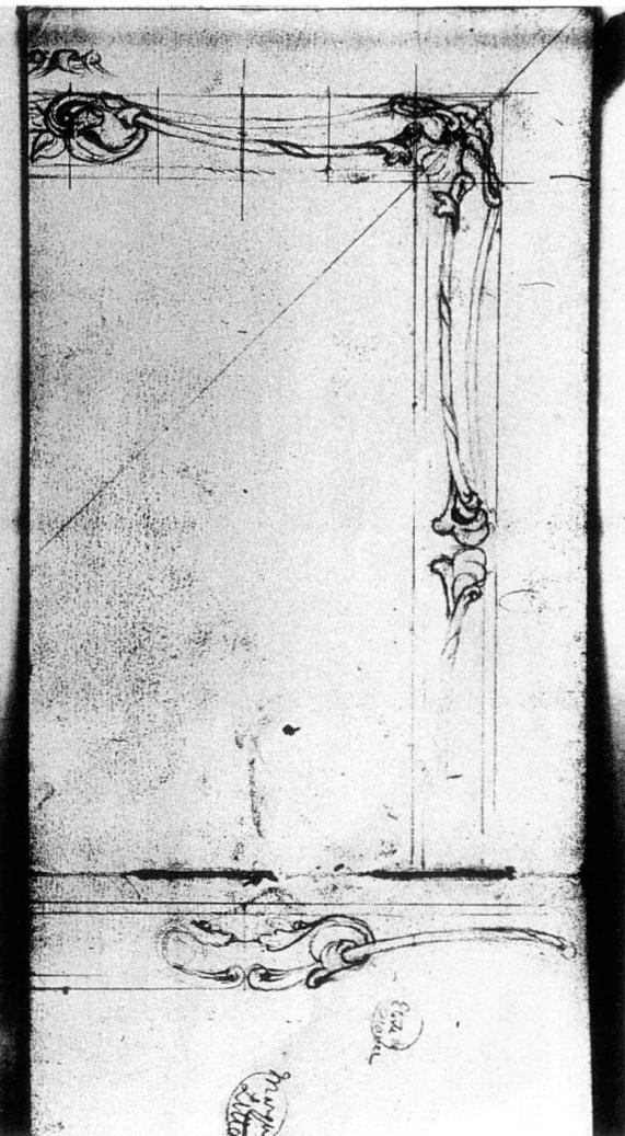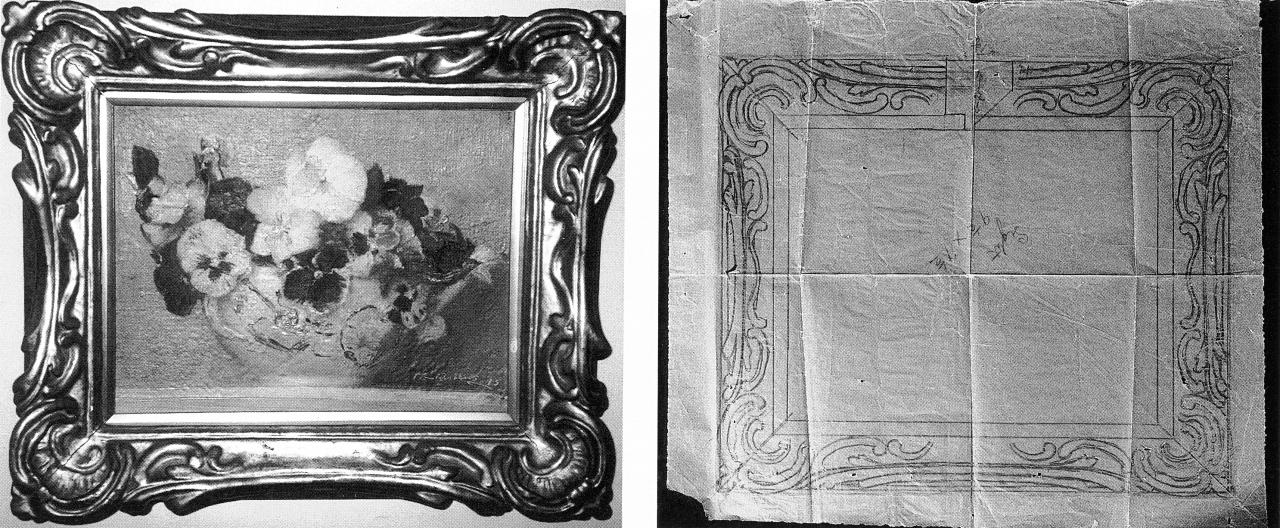 Pansies is still in its original frame (fig. 11), which was made by Williamson at the Golders Green studio.44Mr Noel Roberts, letter to the author, 15 August 1991. The swept articulation of the sections of this frame is characteristic of Williamson’s oeuvre: the carved decoration has a rich fluidity, with boldly conceived corner cartouches de-emphasising the frame’s rectangularity. The whole effect was most likely inspired by French rococo-style frames. The initial design for this frame, also extant, has been located by the author in a private collection (fig. 12).
