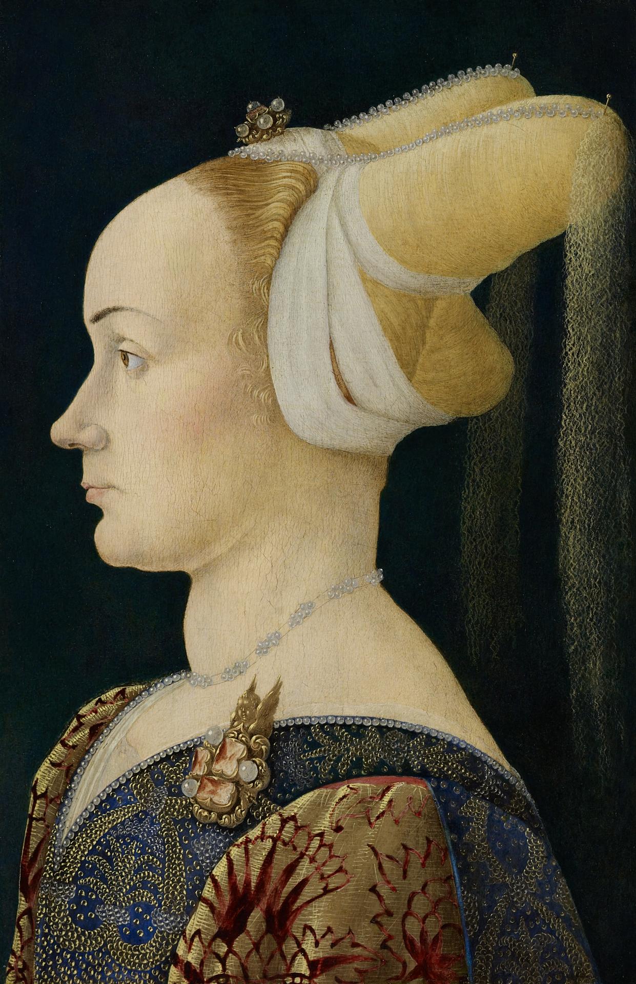 I would argue that jewellery, when it occurs, signifies both the husband’s rank and the woman’s honour. Expensive jewellery was very much a man’s to bestow, in a patrilineal society where women had little income or inheritance of their own to disperse. Usually, jewellery was given by the husband (or father) at the time of a marriage. Advising her son about the adornment of a potential bride in 1465, Alessandra Strozzi wrote ‘She must have beautiful jewels, for just as you have won honour in many things, you cannot fall short in this’.19Alessandra Macinghi negli Strozzi, Lettere di una gentildonna fiorentina del secolo XV, edited by Cesare Guasti, Florence, 1877, p. 446; translated in Lauro Martines, ‘A Way of Looking at Women in Renaissance Florence’, Journal of Medieval and Renaissance Studies, 4. 1974, p. 26. Sumptuary legislation, which restricted the public display of luxurious goods like clothing and gems, allowed more ostentation during wedding celebrations. Probably many profile portraits are of new brides, certainly of wives whose exterior wealth, physical beauty and upright decorum signify and enhance the reputation of the men who commissioned the portraits from male artists.