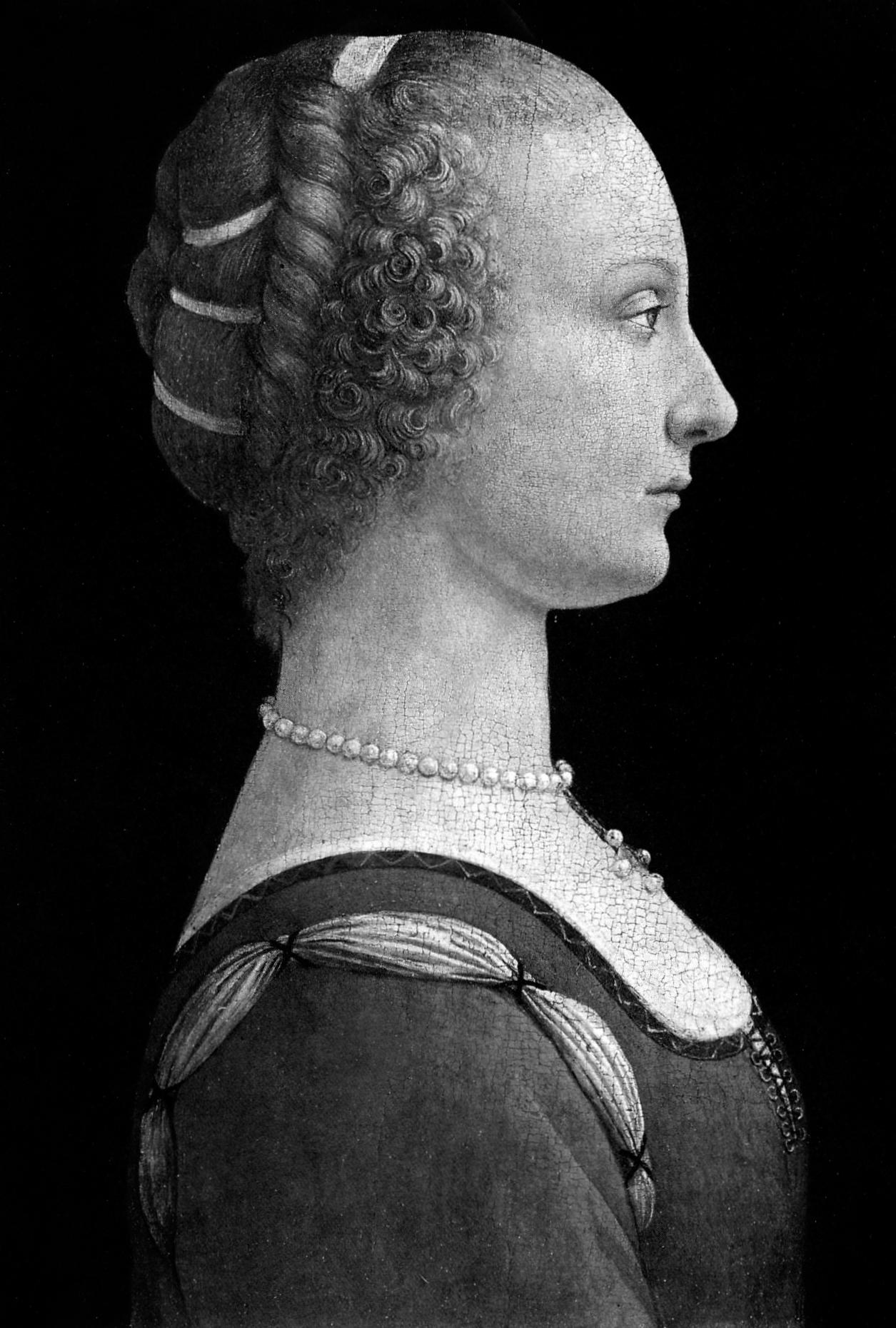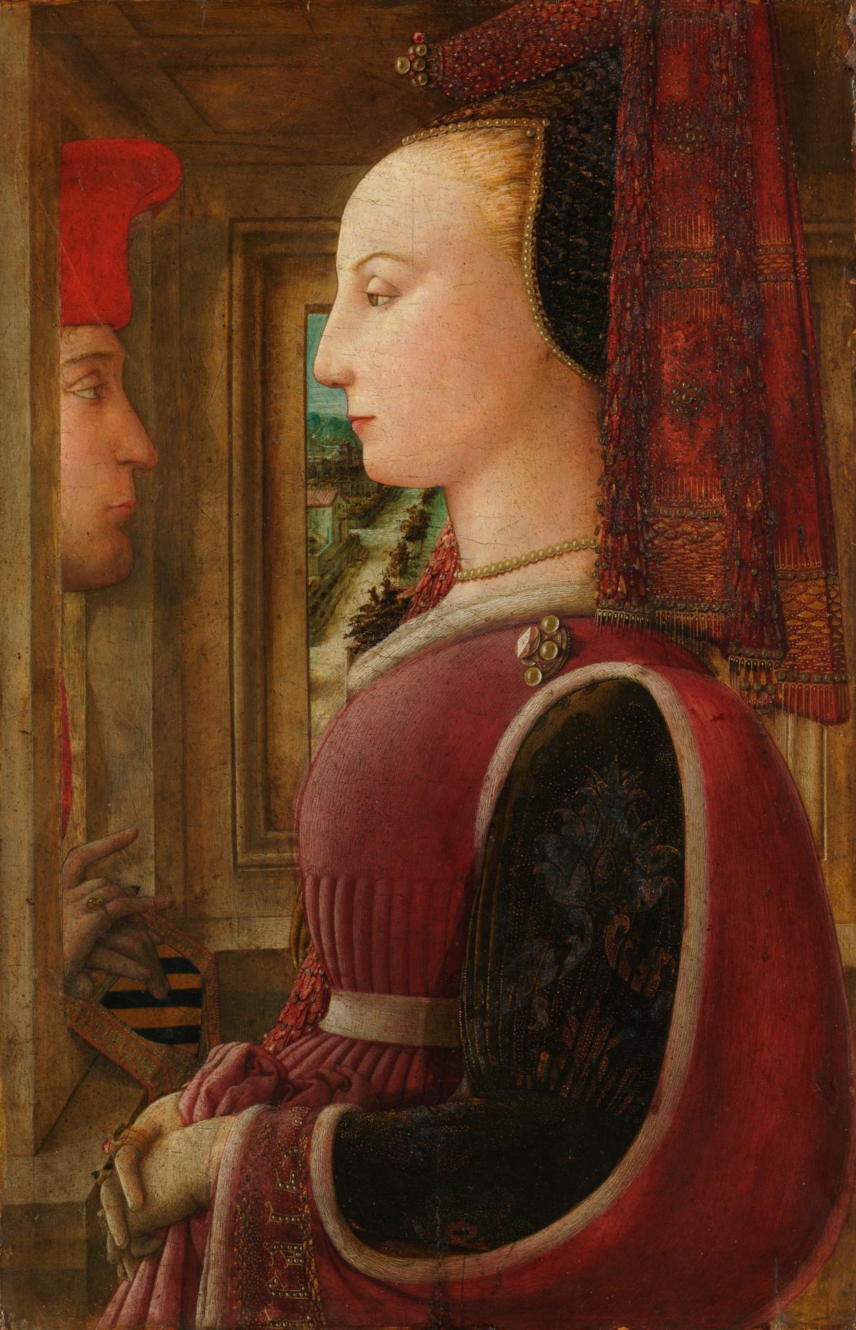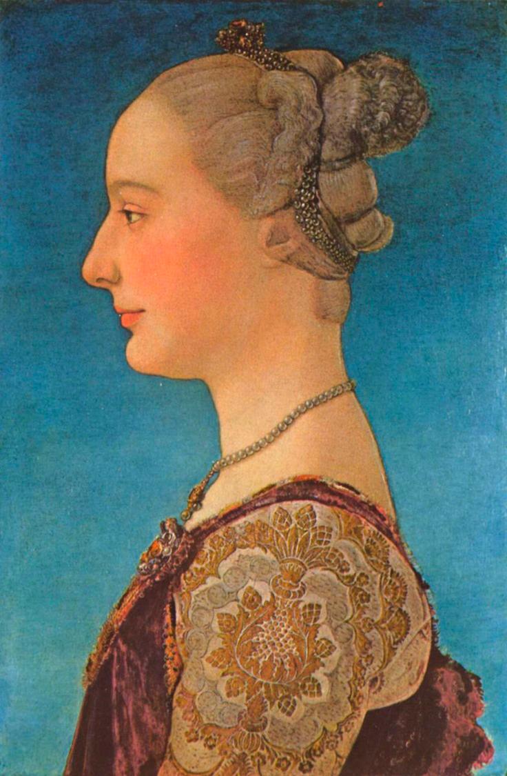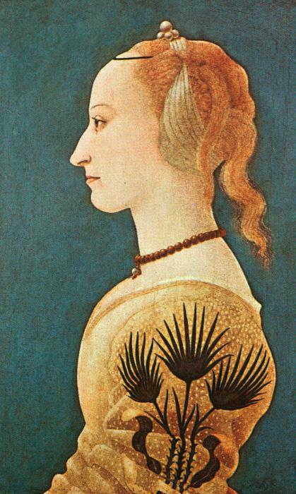 Five male profile portraits began a new convention for portraiture in fifteenth-century Florence, but from about 1450 nearly all subsequent profile portraits from Quattrocento Tuscany are of women. I think an important reason for the predominance of the female presence lies with the profile format itself. The characteristics of this genre, such as the patterning effects and averted eye, particularly suited the representation of upright bearing and the display of face and accoutrements as static, decorative possessions. The richly decorated state of the woman signified her status as an object of exchange when she became a vehicle for display at the time of her marriage. My argument is briefly rehearsed here too, but the opportunity will be taken to enjoy a close viewing of one example.