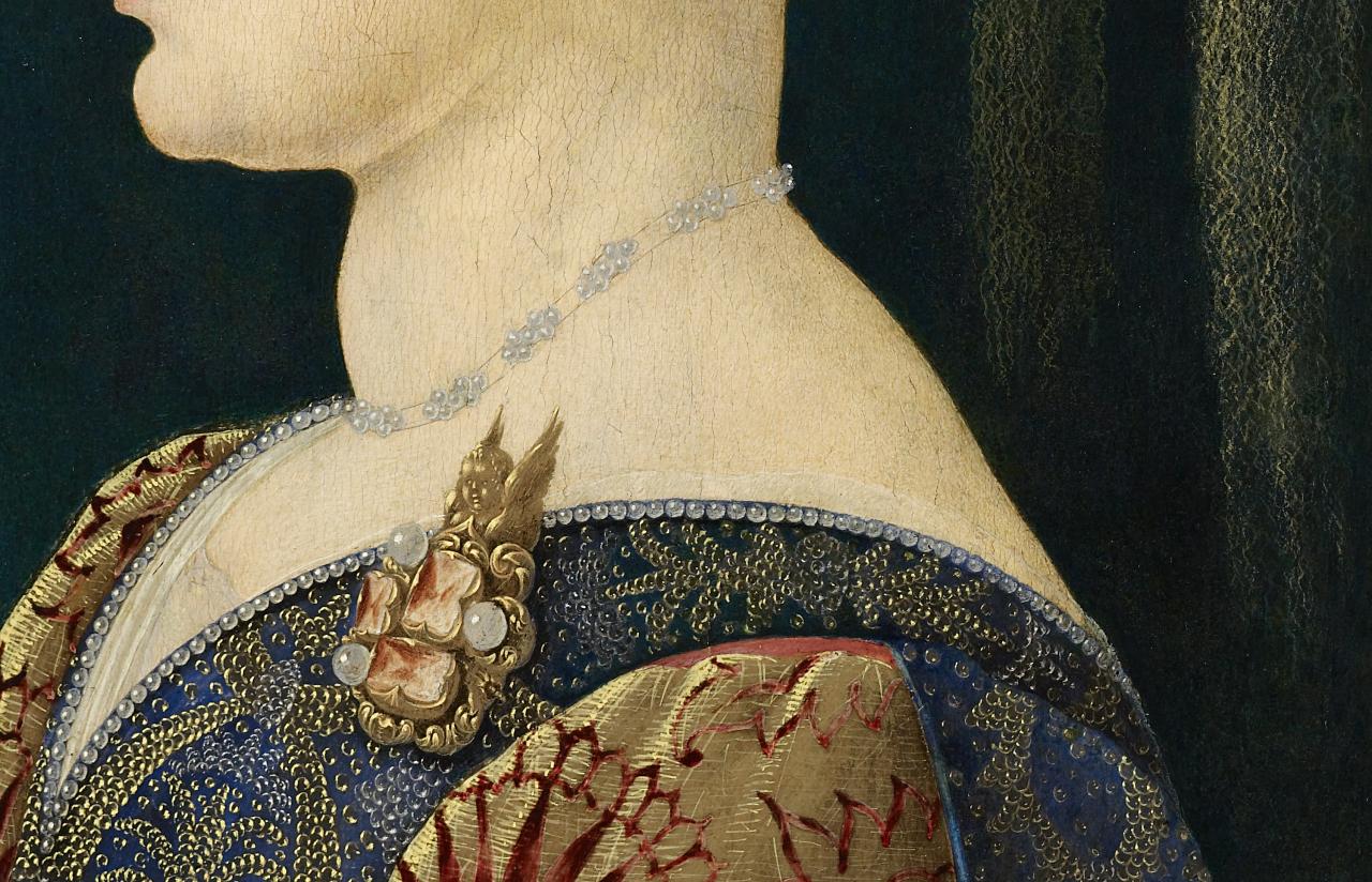 The Melbourne panel seems then to be a late fifteenth-century example of the profile format, by which time women were often depicted in simpler costume, without jewellery, sometimes appearing older, and more likely to be in a three-quarter-turned pose like portraits of men. In choosing an increasingly old-fashioned format, the patron and artist of the Melbourne example resorted to a lavish display of jewellery and rich cloth which was more common in this portraiture convention. The decorative, flat and patterned surface of both face and accoutrements in the profile portraits seems to have more readily lent itself to an emphasis upon luxury goods.