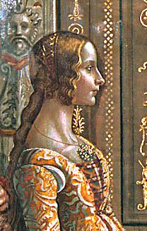 As with the jewellery, comments will be made here about the style, date and significance of the hair in the Melbourne portrait. Like finely spun gold, every strand of hair near the face is carefully painted. This curled hair is pulled by the tension of a tightly gathered bun at the back, above which is a peaked head-dress in the Parisian style or alla Parigina. All the hair, even in the eyebrows, is painted with fine, individual strokes, but from the ends of the head-dress are pinned cascades of false hair (perhaps silk) painted in a more impressionistic, hazy manner. The costume is also executed by a mechanical, repetitive hand; these features may be the work of an assistant, given the task of painting the decorative costume which forms a solid base for the head and a prop for precious stones. But most of the hair, with its crisp curls and linear attentiveness, suggests the hand of a skilled goldsmith or miniaturist.