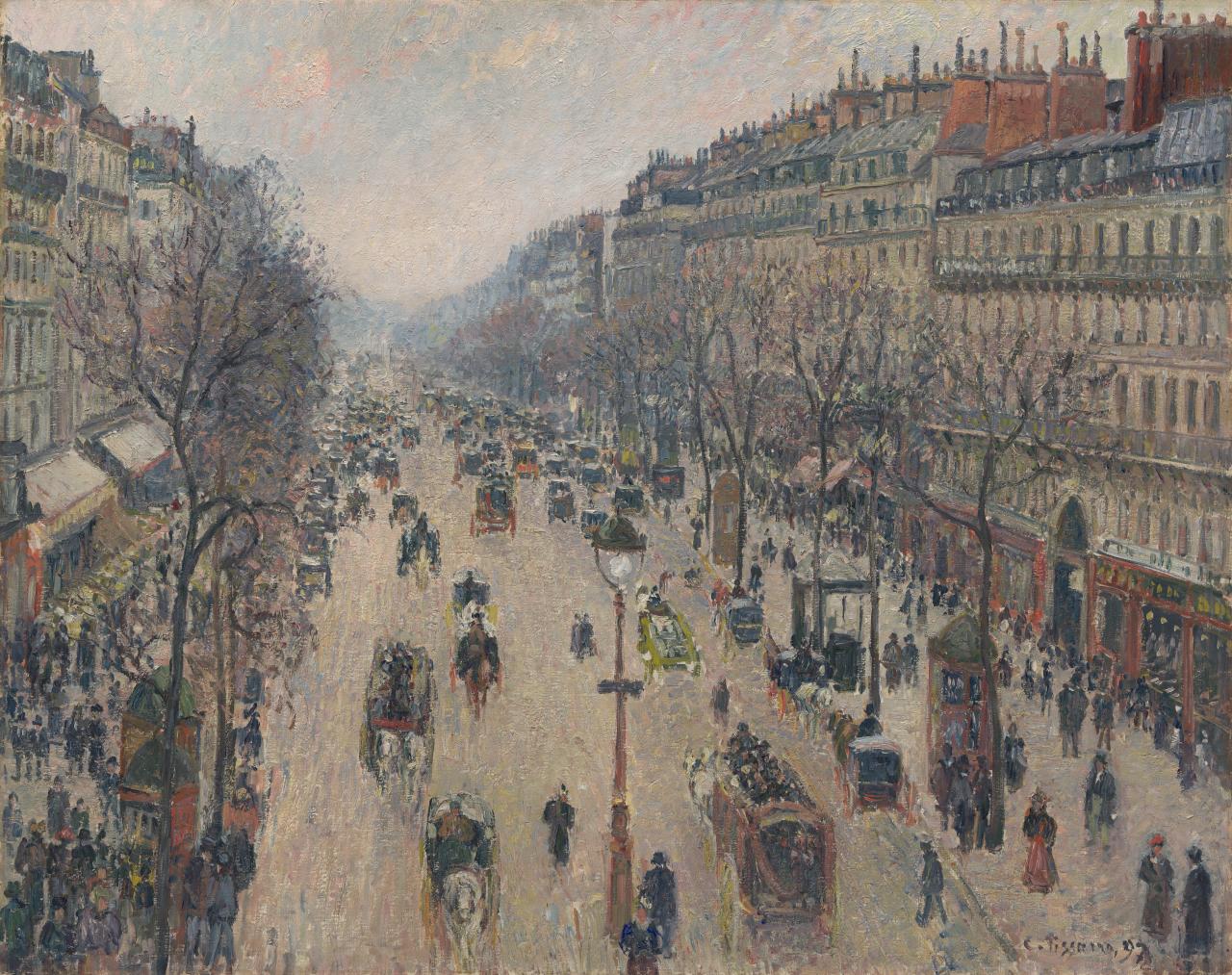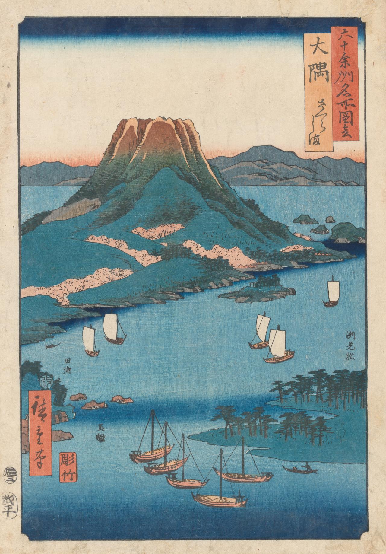 Japanese ukiyo-e woodblock prints often depicted the pleasurable diversions available to newly prosperous Japanese urban middle-classes, including scenes of the licensed red-light districts and the dramatic performances of Kabuki theatre. These images of the urban environment encouraged Western artists to explore the burgeoning late nineteenth-century urban world of great metropolises such as Paris, London and New York. Artists depicted the life of the city and its modern streetscapes in a manner unprecedented in the canons of Western academic art. Gifted by the Felton Bequest, Camille Pissarro’s painting of the Boulevard Montmartre, morning, cloudy weather, 1897, is one of a series of fourteen views looking east along the broad avenue that he painted between 10 February and 17 April 1897. These views show the wide thoroughfare created by the government official Baron Haussman’s remodelling of the centre of Paris from the 1860s onwards, eliminating the narrow, winding streets of the medieval city. The depiction of a bustling crowd strolling through the streetscape owes much to Japanese scenes of fashionable urban life, as does the elevated viewpoint that creates the impression that we are leaning out into the street. This elevated viewpoint can also be seen in Hiroshige’s woodblock print of Sakurajima, Ōsuma province, 1853–1856, gifted to the NGV by the Felton Bequest, which captures a rural landscape from an unusually high vantage point, quite literally from a bird’s eye perspective.