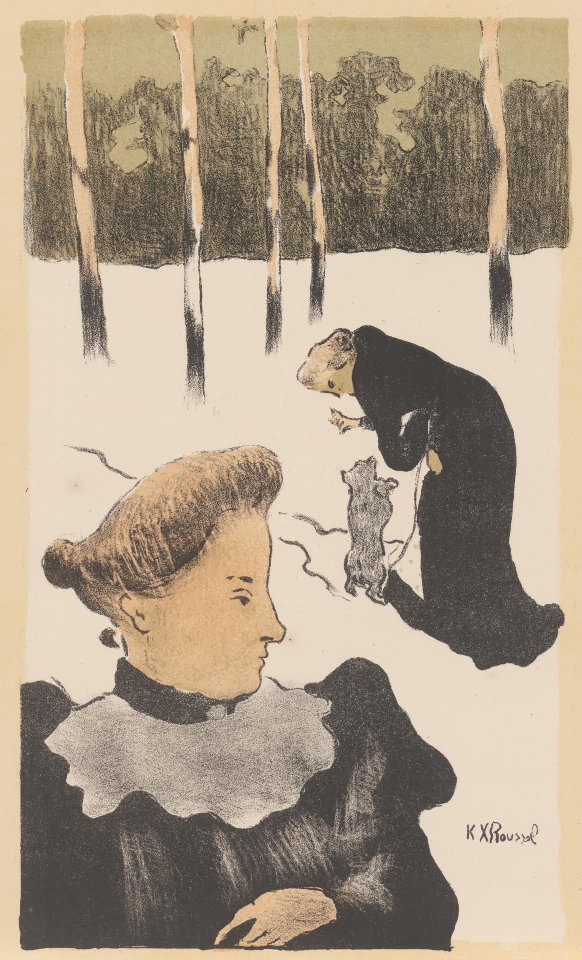 The popularity of Japanese colour woodblock prints in Paris promoted interest in the print as an original art form and inspired a surge of interest in colour printmaking during the 1890s. Colour lithography was the favoured medium adopted by many artists of this period to create colourful posters, albums of prints, illustrated theatre playbills and small journals, including original prints. The formal qualities of Japanese art were reflected in the asymmetrical compositions, unusual viewpoints, decorative patterning and flat, unmodulated colours of many of the period’s most innovative prints. Henri de Toulouse-Lautrec’s posters and prints, with their emphatic two-dimensionality, use of silhouette and vibrant colour owe much of their radicality to Japanese art. Pierre Bonnard, one of the group of young artists who called themselves the Nabis (Hebrew for prophets), was nicknamed le Nabi très Japonard (the ultra Japanese Nabi). His colour lithographs of the 1890s were highly inventive in their assimilation of Japanese influences, extending beyond compositional devices to also include an approach to subject matter as seen in his series Some Aspects of Parisian Life, 1899 and gifted to the NGV by the Felton Bequest. This important album of twelve prints presents incidental views of the modern city of Paris – corners of buildings, rainy street scenes at night – that reflect the anecdotal scenes of daily life captured in such woodblock series as Hiroshige’s One hundred famous views of Edo, 1856–58. Teaching the dog, 1893, by Ker-Xavier Roussel, another of the Nabi artists, shows how the abrupt cropping of the foreground figure, the silhouetted forms of the women, the frieze of trees and the strong verticality of the composition introduces a wholly new approach to the spatial treatment of form and narrative.