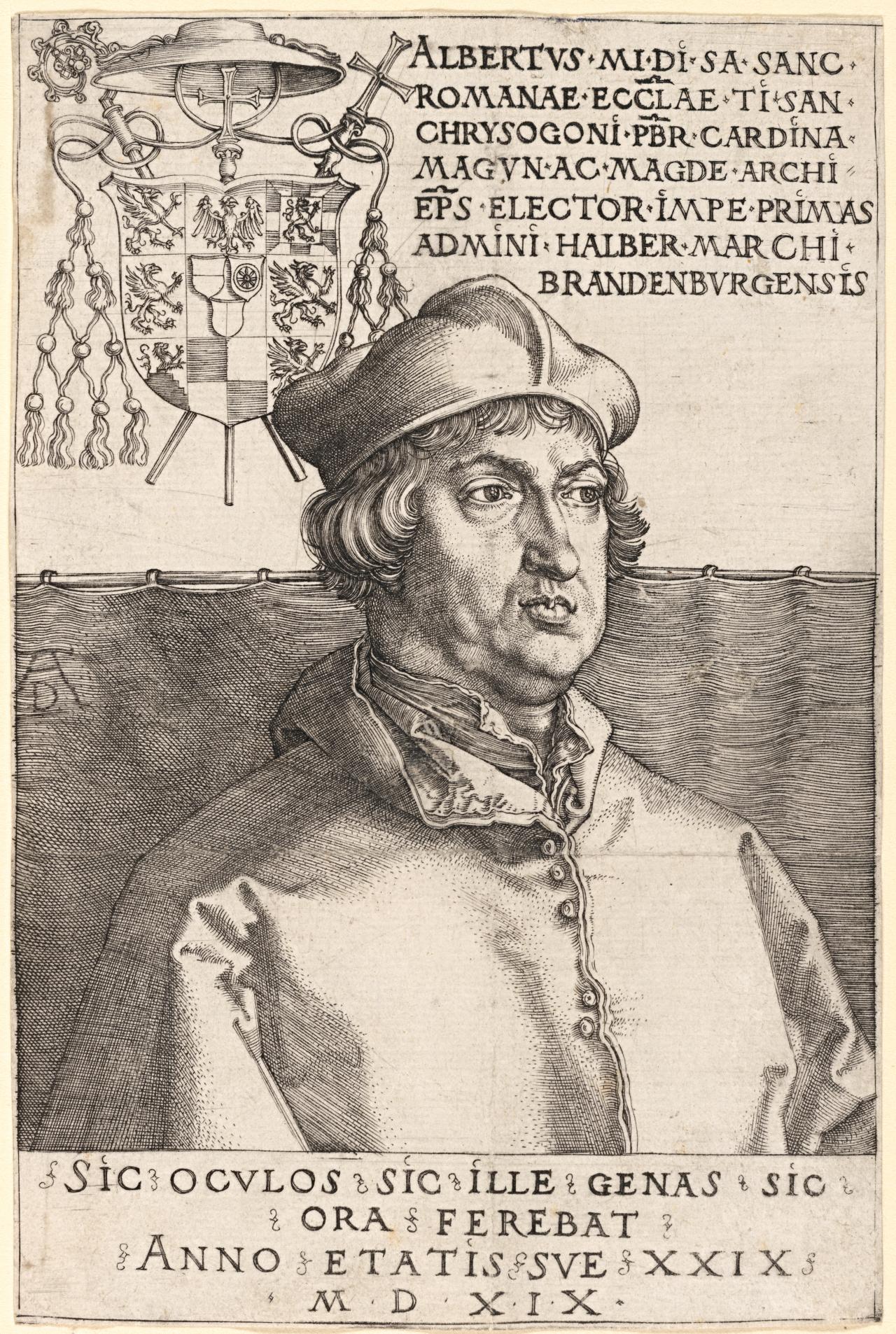 36 See Reber, cat. no. 38. The upper part of the Latin inscription on the engraving reads: ‘Albrecht, by Grace of God Cardinal-Priest of the Holy Roman Church with the titular church of Saint Chrysogonus, Archbishop of Mainz and Magdeburg, Elector, Primate of the Empire, Administrator of the [Bishopric] of Halberstadt, Margrave of Brandenburg’.