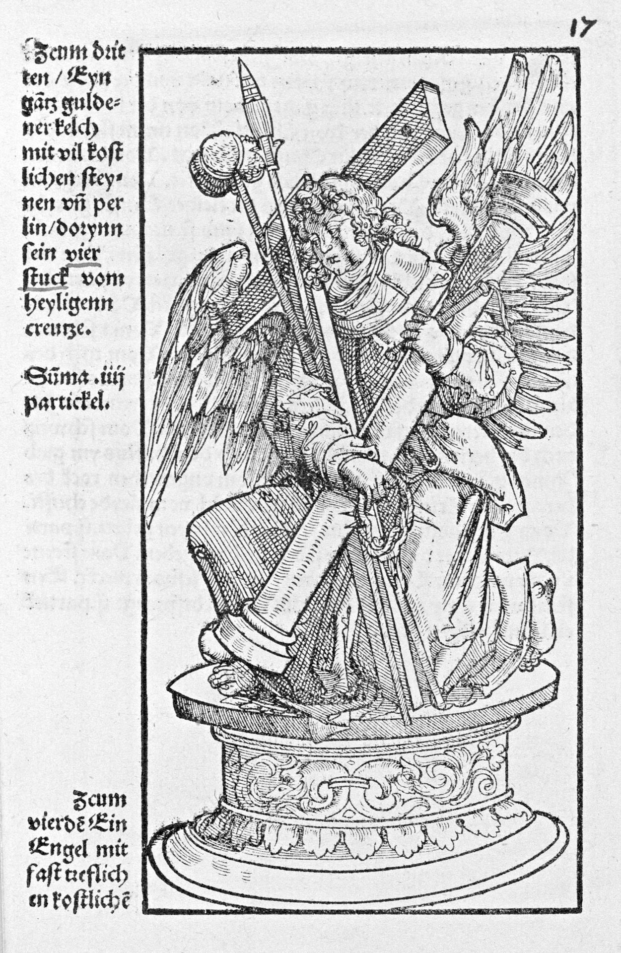 Only in one case does a woodcut (E3r; fig. 7a) bear no resemblance at all to the object depicted in the Aschaffenburg manuscript (fig. 7b). The reliquary in question is described in both books as ‘an angel, embroidered with very fine precious stones and pearls’.50Halle Relic Book, 1520, fols E3r–E3v; Hallesches Heiltumsbuch (Halle Relic Book), c.1526, Hofbibliothek, Aschaffenburg, MS. 14, fols 87v–88r; Halm & Berliner, p. 32, no. 76. While the woodcut shows a kneeling angel holding the Instruments of the Passion, the designer obviously had no access to a sketch made after the original but had to come up with a free interpretation of the subject. Essential elements such as the cloth of the angel’s gown, the date 1518, the coat of arms of Albrecht von Brandenburg, and his symbols of power – the mitre and the cardinal’s hat – are all missing in the woodcut but are represented in the illuminated manuscript.