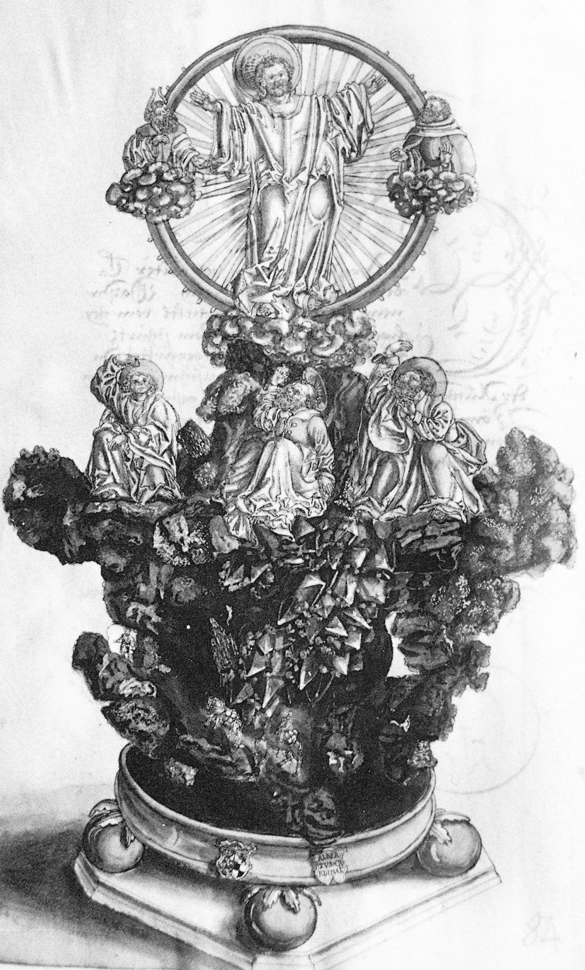 Frequently, parts of a reliquary have been depicted in reverse in the printed relic book. This is true for instance of the sculptural group portraying the Transfiguration of Christ, a group that included three Apostles lying on the ground and the busts of the prophets Moses and Elijah to the left and the right of Christ (fig. 8b). While the overall representation of the scene is accurate in the woodcut version, the orientation of the group of Apostles has been reversed, and the figures of the two prophets have been transposed (E6r; fig. 8a). In addition, the woodcut does not show that the silver figures were mounted on a large piece of iron ore, a detail that would become fashionable in the curiosity cabinets of the late sixteenth century.