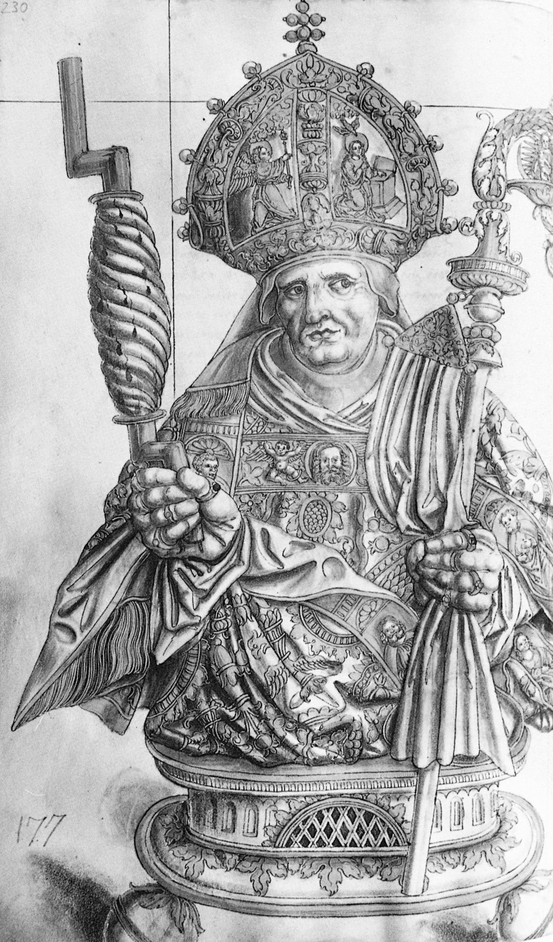 As woodcuts in early printed books frequently show neither a signature nor the initials of the responsible draughtsman, the question of their authorship often remains a matter of attribution. Of the 237 images in the Halle Relic Book, only the representation of the silver statue of St Peter (K3v) bears the combined initials WT, indicating that the Nuremberg artist Wolf Traut created this particular print (fig. 1a).5Wolf Traut has been associated with the circle of Albrecht Dürer (see Meister um Albrecht Dürer (exh. cat.), Germanisches Nationalmuseum, Nuremberg, 1961, cat. no. 393). On the basis of stylistic similarities it can be assumed that Traut provided a considerable number of designs for the decoration of the relic book. His prints are of particularly high quality and he succeeds convincingly in portraying the three-dimensional character of the reliquaries depicted. The artistic quality of the printed relic book was further enhanced, as we shall see, by the insertion of a very fine engraved portrait of Albrecht von Brandenburg by the leading German printmaker Albrecht Dürer, also from Nuremberg. The involvement in the project of other, at times less gifted, artists is evident in a number of weaker depictions of full- and half-length relic containers, such as the gilded silver statue of St Victor (P2v) or the bust of St Gereon (I5v).