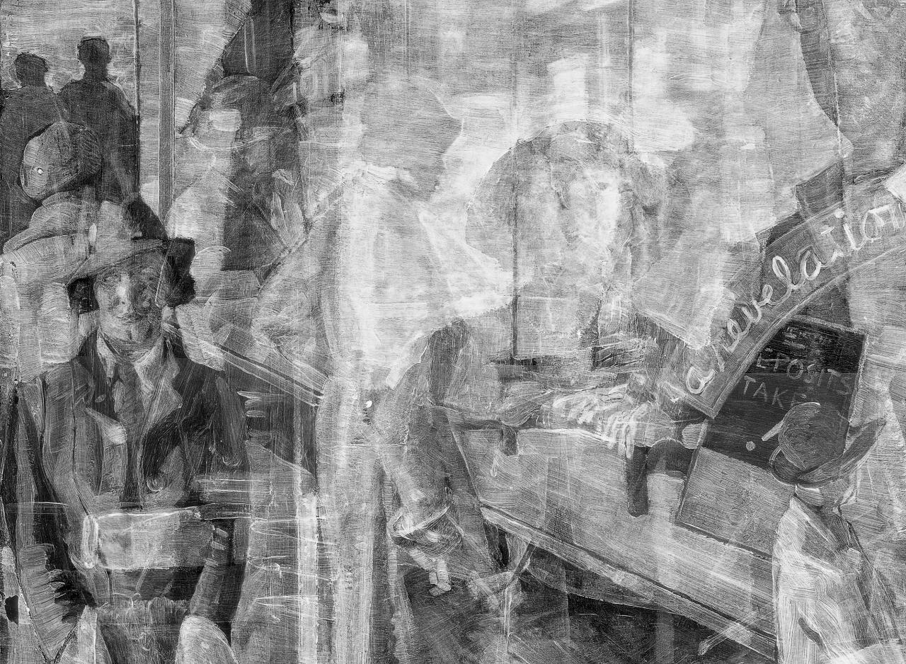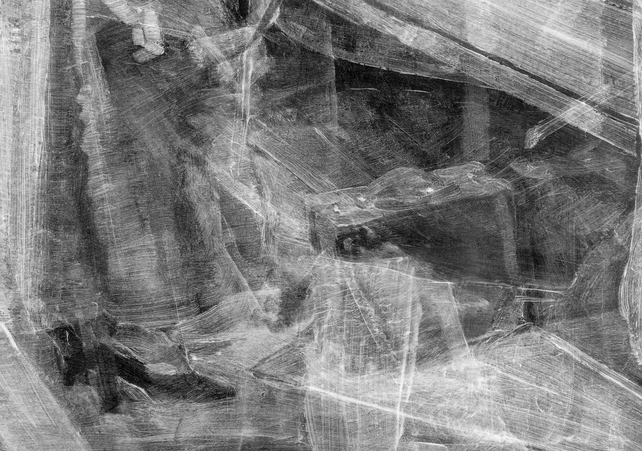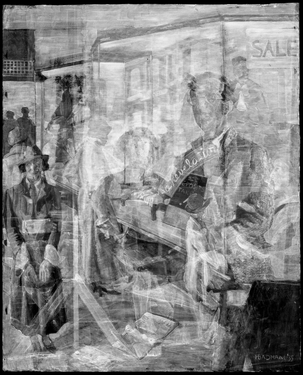 Full X-radiograph showing underlying composition depicting figures and a shop window display