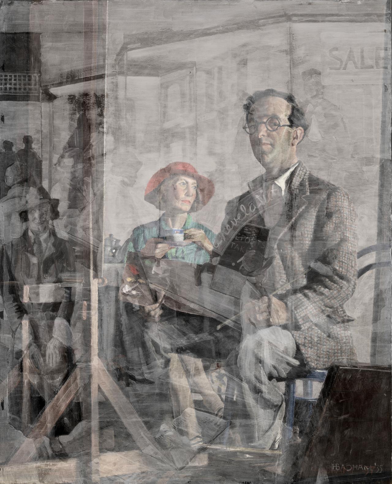 The newspaper or magazine flipped open in the foreground imparts a sense of mystery or foreboding, as if something unexpected is happening or is about to happen. Badham’s Breakfast piece featuring the artist’s wife Enid, also incorporates a casually placed newspaper at the edge of the frame. This contains a verbal reference to Mussolini’s invasion of Abyssinia, introducing a jarring note into an otherwise peaceful domestic scene. iii Although the fine detail of the newspaper is not visible in the X-ray of The frock shop, it may well have contained words or images referencing contemporary events.