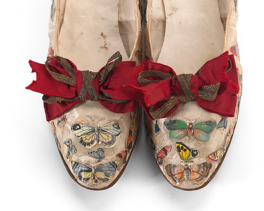 Fancy dress costumes presented in fashion plates and publications were suitable to be made by ladies at home or by a professional dressmaker. The wearer of the NGV’s Scrap Album Fancy Dress is likely to have chosen her relatively demure theme and taken it to the court dressmaker, Madame Gough. The dressmaker created a fashionable base garment and adapted it with the embellishments and trims which brought the ‘Scrap Album’ theme to life. Like many other fancy dresses of this time, the embellishments are placed on an upper layer of the skirt and bodice. This embellished layer could be removed after the event and the dress could be re-used as part of a regular wardrobe. However, it is hard to imagine that the fan, sash and shoes could be readily incorporated into another outfit.