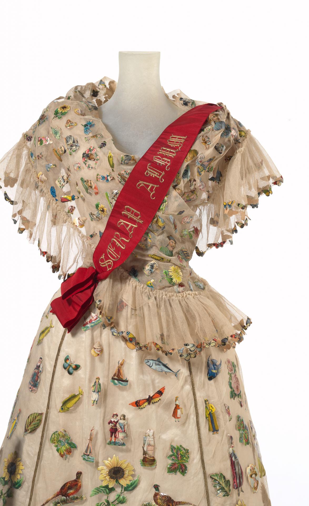 The Scrap Album Fancy Dress, made in London c.1893, is a wonderful example of Victorian era fancy dress. The dress features 100’s of decoupage paper cut-outs, which cover the cotton tulle layers that float above the bodice and skirt. The dress was worn with matching shoes, sash and a fan. In case the theme was not immediately obvious, the bright red silk sash declares ‘Scrap Album’ in wax and gold paint. The costume is a visual merging of two important Victorian pastimes: fancy dress costume and the compiling of ‘scraps’ or ‘scrap’ albums.