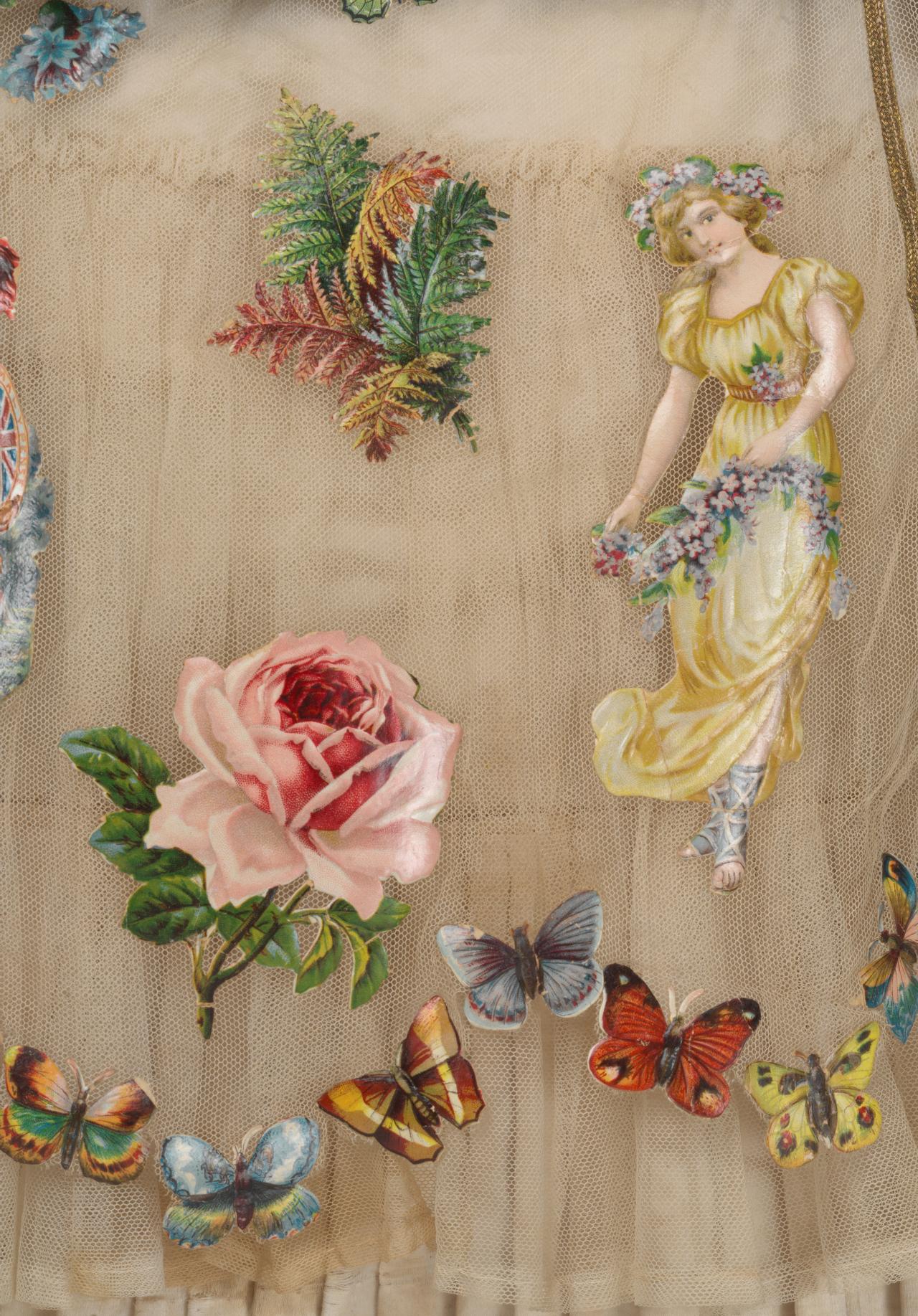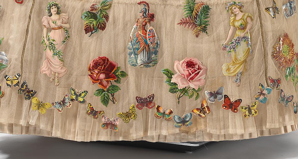 The theme of the dress is inspired by an important pastime for both adults and children in the Victorian era. Scraps had first appeared at the beginning of the 19th century as simple black and white engravings, which were often hand-tinted. They were printed in sheets and needed to be painstakingly cut-out by hand, before being pasted into albums, that contained poetry, letters, paintings and drawings. These albums were used as an extension of a diary, usually by young ladies. By 1837, the first year of Victoria’s reign, a process of colour printing called chromolithography was invented. Scrap manufacturers quickly adopted this new technology allowing the printing and embossing processes to be automated, resulting in a huge increase in production. The scraps were printed, then coated with gelatine and gum to give them a shiny surface, before embossing. A stamping press was then used to cut away the excess areas of paper from the design, leaving the individual scraps connected by small ladders. 5 With the laborious task of cutting out small pictures removed, the sale and popularity of these colourful scraps dramatically increased. The wide range of motifs available can be seen on the Scrap Album Fancy Dress where scraps include exotic men smoking pipes, angels, butterflies, plants and flowers, animals, historical characters, ships and clowns.