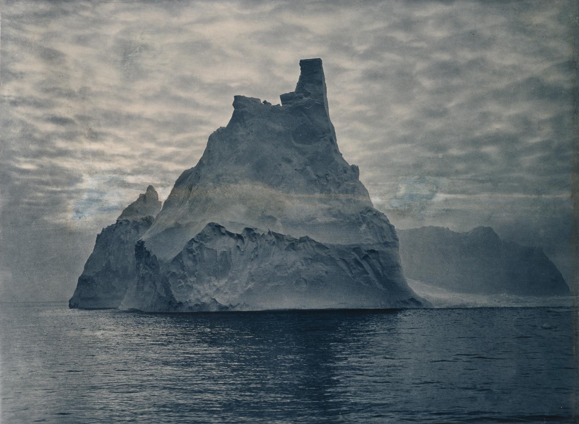 Among Hurley’s photographs taken on the Aurora in 1913 is A turreted berg, a striking study of a lofty iceberg. The photograph shows an iceberg that has been transformed by the elements into a floating pyramid of ice. In his writings, Hurley repeatedly refers to the intensity and purity of colour of the icebergs. In A turreted berg he has not employed the newly invented colour processes, but has made selective use of toning chemicals to alter the colour of the carbon photograph.15 For an explanation of the carbon process, see Newton, p. 206. In this case the normally neutral tonal range of this kind of photograph has been shifted to an intense shade of blue, this colour reflecting more naturalistically the actual tones of the subject.