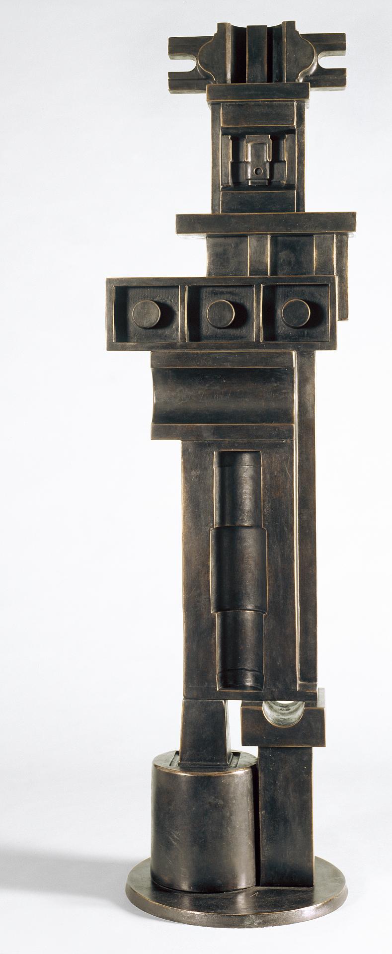 As a natural progression from these clipped and carefully tiered works, the sculptor has experimented lately with assemblages which retain his traditional vertical format, but are composed of industrial wooden patterns used in foundries for the casting of machine parts. A number of artists, including the Australian sculptor Colin Lanceley,3Colin Lanceley’s The King in his counting house 1964–65, purchased by the National Gallery of Victoria in 1976, is one such work utilising found objects, such as industrial wooden patterns. have utilised such patterns for their precise and logical configurations and for their extraordinary wealth of formal detail, such as flanges, bosses, cones, cylinders, discs, and so on.