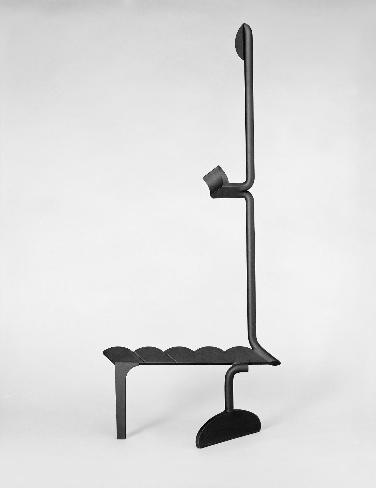 Black magic 1984–85 by Inge King (fig. 2) is an assembled steel work painted a svelte matt black. It joins three earlier works6A small bronze panel, Magician, purchased 1961; a maquette (steel) for an A.M.Ρ sculpture, presented in 1971; untitled maquette (steel, aluminium), purchased 1981. by this sculptor in the collection, which could not be considered as appropriate to represent her mature style. King’s constructivism is distinguished by an unerring sense of monumentality which, especially in recent works like Black Magic, is infused with a decidedly lyrical, often calligraphic element. King’s sculpture is widely known as a consequence of her many important public commissions – one of the most recent and most outstanding being Forward surge, installed near the Gallery on the grassed bank separating the Concert Hall and the Theatres. The four colossal arched units of that sculpture evoke an awesome wave motion which, it seems, might eventually result in a great and terrifying pounding and cascading of matter at the foot of the work. But, for the moment, the motion is suspended, frozen, so that the observer may move beneath and between the great arcs and experience the energy which charges the intervening space. Albeit on a reduced scale, Black magic also speaks of the endeavour to invest a work with intense energy and tautness, whilst providing large discs or sections of heavy metal with an agreeable sense of lightness and buoyancy. Black magic is one of a series of recent pieces which incorporate framing devices within which individual components may be viewed or juxtaposed in a variety of pseudo-‘pictorial’ compositions. Sometimes various units in these newer works assume a character not previously encountered in King’s work. Such units could be designated as possessing a certain literal quality in that they invite interpretation as a passageway, a door, a shelter, and so on.