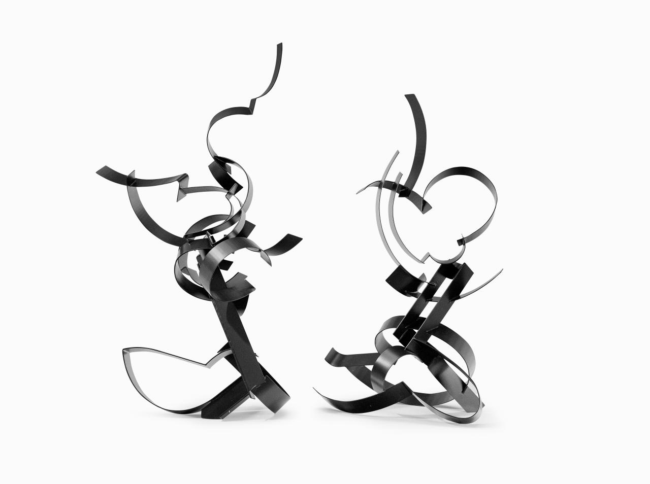 Black magic provides no clues in this regard, but it does demonstrate the sculptor’s current preoccupation with what I have described as a ‘pictorial’ composition. The work has a principal viewing angle – as does Clifford Last’s Metamorphosis I – and is contained by a rectangular frame supported above a solid, rectangular base. The base, in turn, gives rise to the focus of the work: the large, gently rolled disc gracefully balanced upon a slender stem, whose proportions and direction are echoed in a small finial sprouting from the uppermost member of the frame. The disc sits just behind the framing device and to one side of the tableau, and is balanced in terms of density, profile and placement by the somewhat impertinent coil which lurches towards the orb from the far corner of the tableau. This is a splendidly witty gesture, combining deference with comedy in a decision which perfectly and coolly contrasts the slow and lissom choreography of the large disc with the more frolicsome rhythm of the coil. Black magic is a work which invites the viewer to take stock of the negative, airy spaces within the frame, as well as the impeccable distribution and selection of the forms themselves. Here is a rigorously formalist sculpture which exudes, in no small measure, a quality of mystery entirely befitting its title.