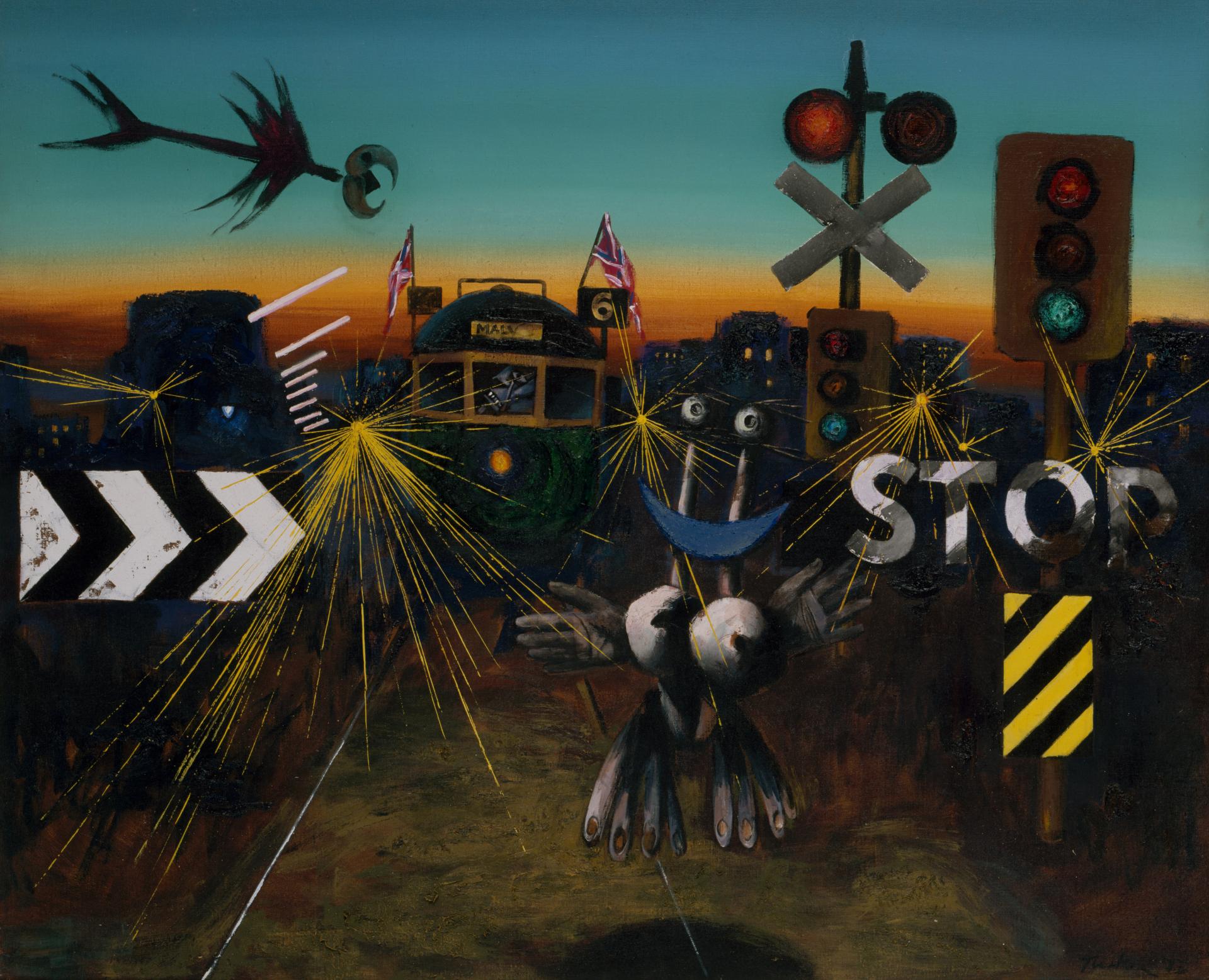 City offers a summation of the themes for which Tucker is most renowned. The iconography – including hazard signs and stop signs, traffic tights, signals and street lights, commercial and residential buildings, and a tram – remains inextricably linked to Melbourne. The painting was included in Albert Tucker: A Retrospective at the National Gallery of Victoria in 1990 and was reproduced on the cover of the exhibition catalogue. At the conclusion of the exhibition the work was identified as essential for the NGV collections.