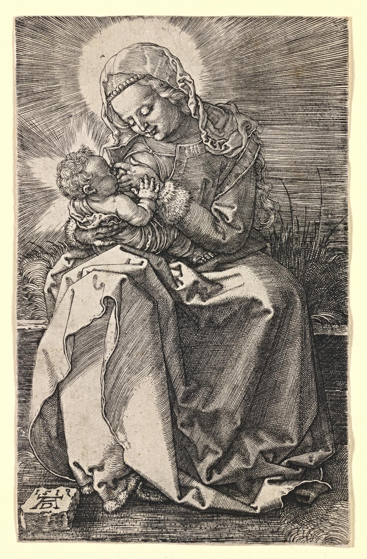 Even if we allow for a rather more stoic fifteenth-century attitude to childbirth and high infant mortality rates, the experience must have left a lasting impression on Dürer’s mind, shaping his understanding of the special relationship between a mother and her infant. Reading his observations on his mother’s nature in his Family Chronicle, we are struck by the associations they evoke of contemplative descriptions of the Virgin Mother. Thus Dürer tells us that her favourite pastime was to speak of God and praise him, that she suffered ‘illnesses, poverty, mockery, contempt, and snide words, fears and obstacles, and yet felt no spite’, but quietly continued ‘her pious ways and acts of mercy to every man’, observing her children’s religious upbringing, and habitually receiving and dismissing Albrecht and his brothers with the same phrase: ‘Go in the name of Christ’.7 ibid., p. 37.It is difficult to tell whether Dürer based the description of his mother on the role model of the Virgin Mary, or whether the experience of his mother’s attitude to life engendered in him a special affinity to the Virgin; either way we find reflections of it in his visual characterisations of the Virgin and Child. Dürer’s memories were recorded in 1514, at the time of his mother’s death, an event which led not only to an intense exploration of his own state of mind through the Melencolia I (B.74), but also, significantly, brought about the greatest concentration of works on the subject of the Virgin and Child.8 Dürer’s mother’s declining years from 1511 on coincide with a recurring exploration of the Mother and Child theme in her son’s work. For the year of her death, 1514, at least six drawings of the theme can be recorded, and two engravings: The Virgin on the Crescent with a Diadem (B.33) and the Madonna by the Wall (B.40).