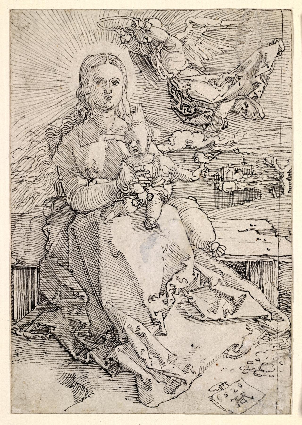35 The only comparable image is the Madonna, Queen of Angels (B.101), a woodcut of 1518 in which Mary and the Child are surrounded by a heavenly retinue of angels, paying homage, making music and playing. It is Dürer’s most regal print of the Virgin and Child, and also the largest (after that of the Holy Family with Three Hares, c. 1496 (B. 102)), clearly made to satisfy orthodox devotional needs.