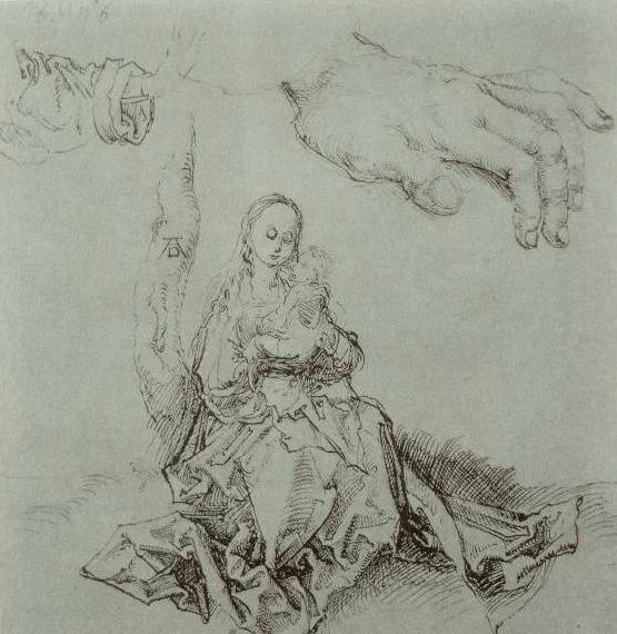 2 Dürer’s earliest work known on the theme, made at age fourteen, is a pen and ink drawing, the Madonna and Child Enthroned with Two Musical Angels, now in the Berlin Kupferstichkabinett. Executed in a style reminiscent of Schongauer and the Master E. S., two most significant masters for Dürer’s early artistic development, it bears the artist’s monogram and is dated 1485. The influence of earlier German masters on Dürer’s depictions of the Virgin are discussed in L. Lorenz, Die Mariendarstellungen Albrecht Dürers, Strassburg, 1904.