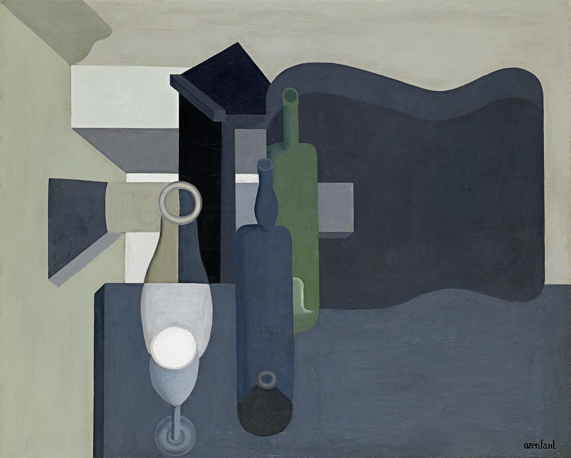 While attacking Cubism’s later floridities, the two young Purist champions retained a veneration for one of Cubism’s central iconographic elements – the wine bottle. This, they felt, offered for art a perfect ‘object prototype’, an invariable and stable form that had been rendered permanent and immutable in time. Understandably, then, still life was soon to become the sole subject matter in their mature Purist paintings, which rejected representational volume and mass, eschewed naturalistic colour, and rendered visible brushstrokes as uniform and non-individualistic as possible.