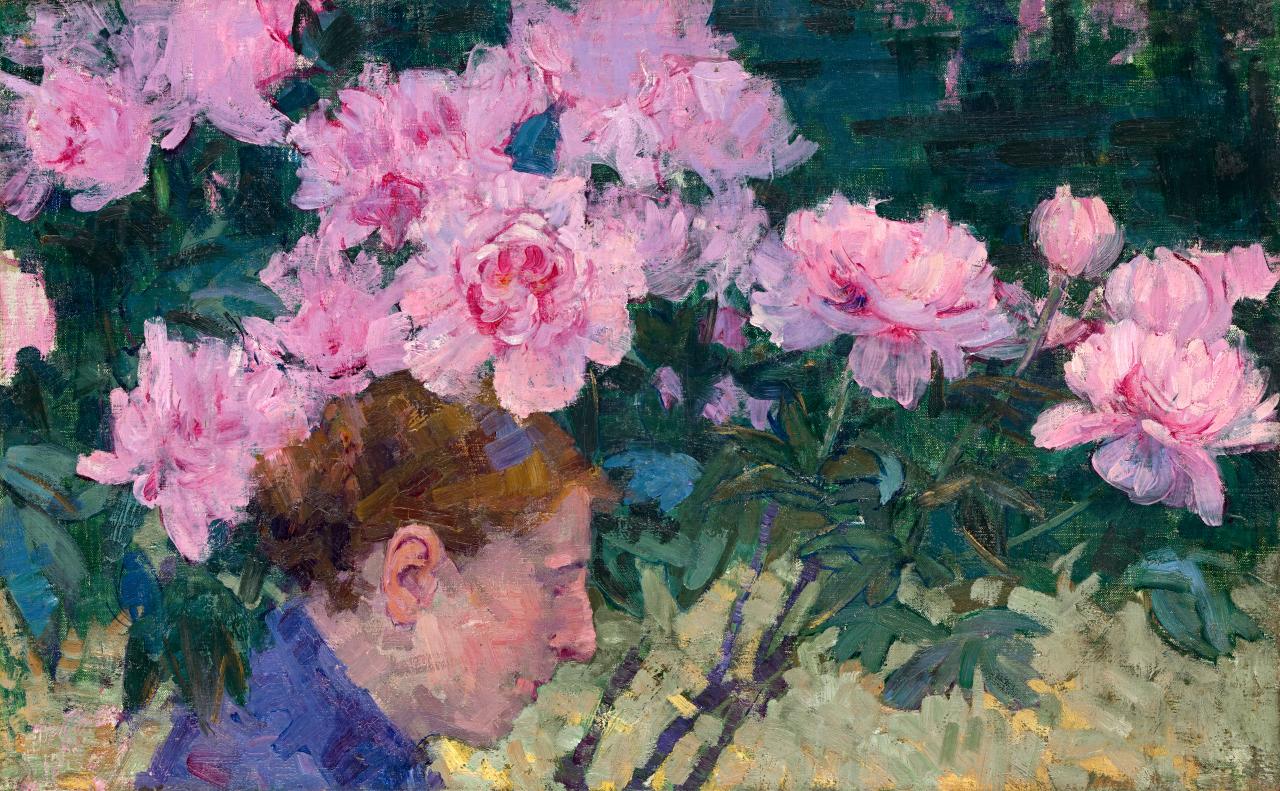 The Russell study indicates an entirely new approach to pictorial space, one in which the three-dimensional forms are flattened out and set one behind the other as if they were a series of screens. At the same time Russell shows a new interest in colour resonance and purity. In Peonies and head of a woman (oil on canvas, 65 x 41 cm, The Joseph Brown Collection, Melbourne) (fig. 3) one of a series of heads set amongst flowers, Russell has schematised a setting which had been popular with Rosetti and Burne-Jones in the 1860s, and with G. F. Watts – an artist whom Russell is known to have admired. He has set the head, seen in profile, low on the horizontally-shaped canvas, beneath a heavy grouping of pink and white peony roses and dark green leaves. The screen-like arrangement, which is broken behind the head in the centre and at the lower left to allow the warmer-toned greens and yellow to show through, is far more dependent upon the flat pictorial structures of Japanese prints than it is upon Victorian prototypes. The picture is set in daylight, and Russell has carefully registered the green in the shaded flesh of the face.