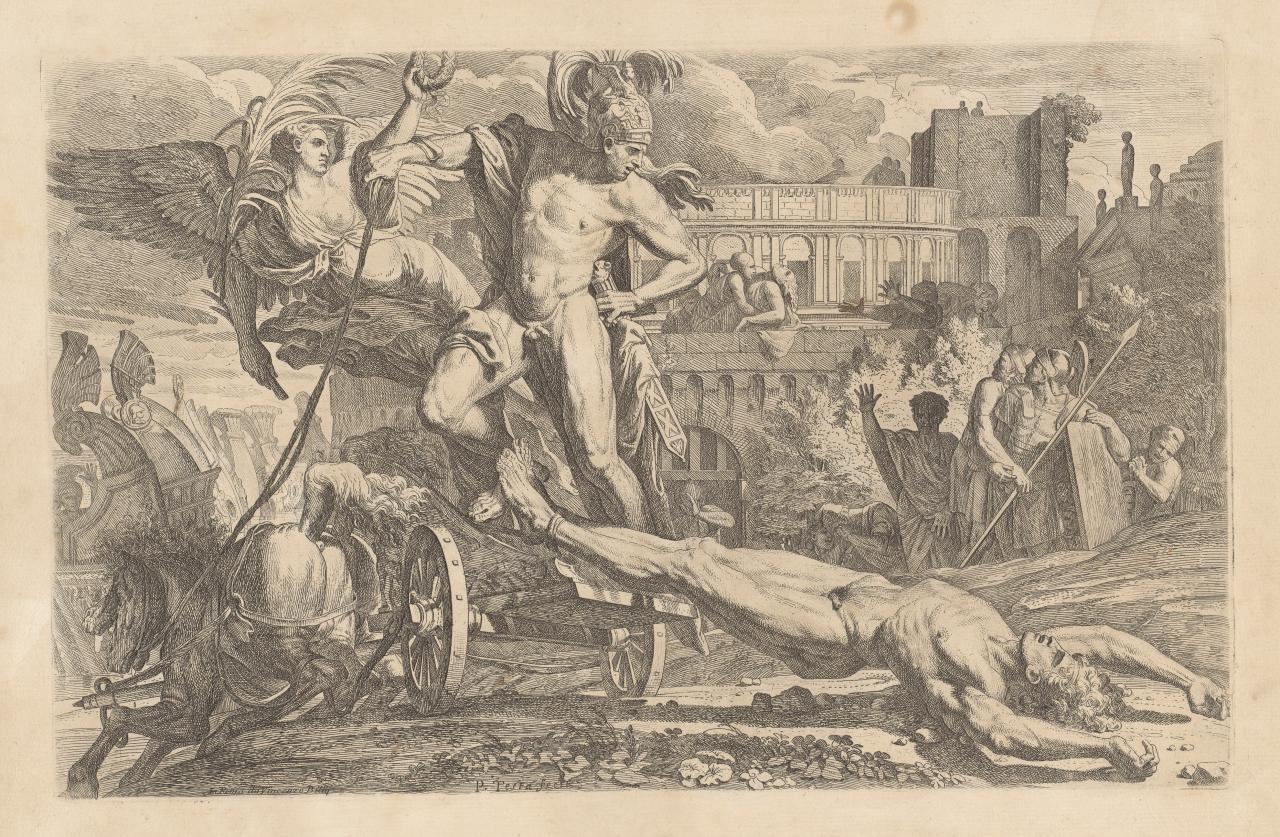 Achilles then defiles Hector’s body, dragging it around the walls of Troy, as shown in a seventeenth-century etching by Pietro Testa. Later in the Iliad, Achilles speaks as he buries Patroclus of how ‘I have laid Patroklos on the burning pyre, and heaped the mound over him, and cut my hair for him, since there will come no second sorrow like this to my heart again while I am still one of the living’.3Iliad, Book 23: 45–7, Lattimore, p. 451. Homer, as narrator of the epic poem, further tells us: