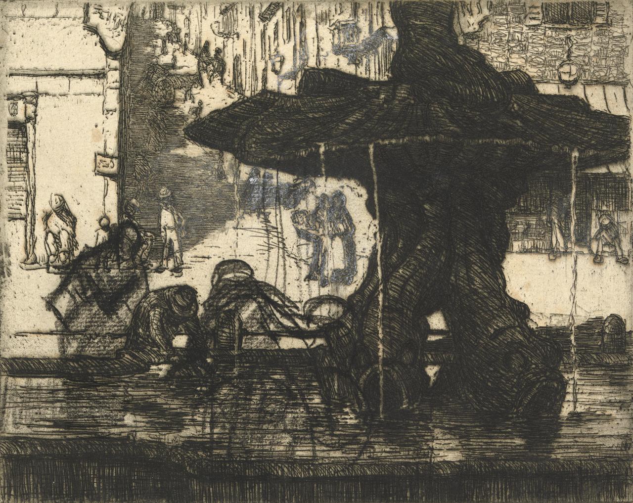 Traill obediently altered her print, progressing through a second and third state before finally leaving it alone altogether. The sharp contrast between the lightly etched street which forms the background, and the monstrous black image of the fountain pushed towards the viewer, has been greatly diminished in the post-Brangwyn impression. With the addition of a peasant woman and child standing on the street side of the fountain, and a shadow obscuring its edge on the right, the eye moves more gently from one plane to the next. Moreover, the presence of Brangwyn’s figures is intrusive in a way that the man in the hat (burnished out) was not. Such a great deal depends upon details like these; they incorporate the yawning gulf which can divide the artistic sensibilities of two individuals. Traill’s vision of the fountain as expressed in her first state was an attempt to come to terms with the formal essence of the object itself. The asymmetrical placement and the expanse of lighter background were fundamental to the realisation of that vision. By his inclusion of the figures, and subtle alterations of the relationship between the fore- and background planes, Brangwyn imprinted a radically different aesthetic. His main concerns were a filled and balanced composition, a harmony of contrasts and a movement, or impression, of life that was quite alien to his student.