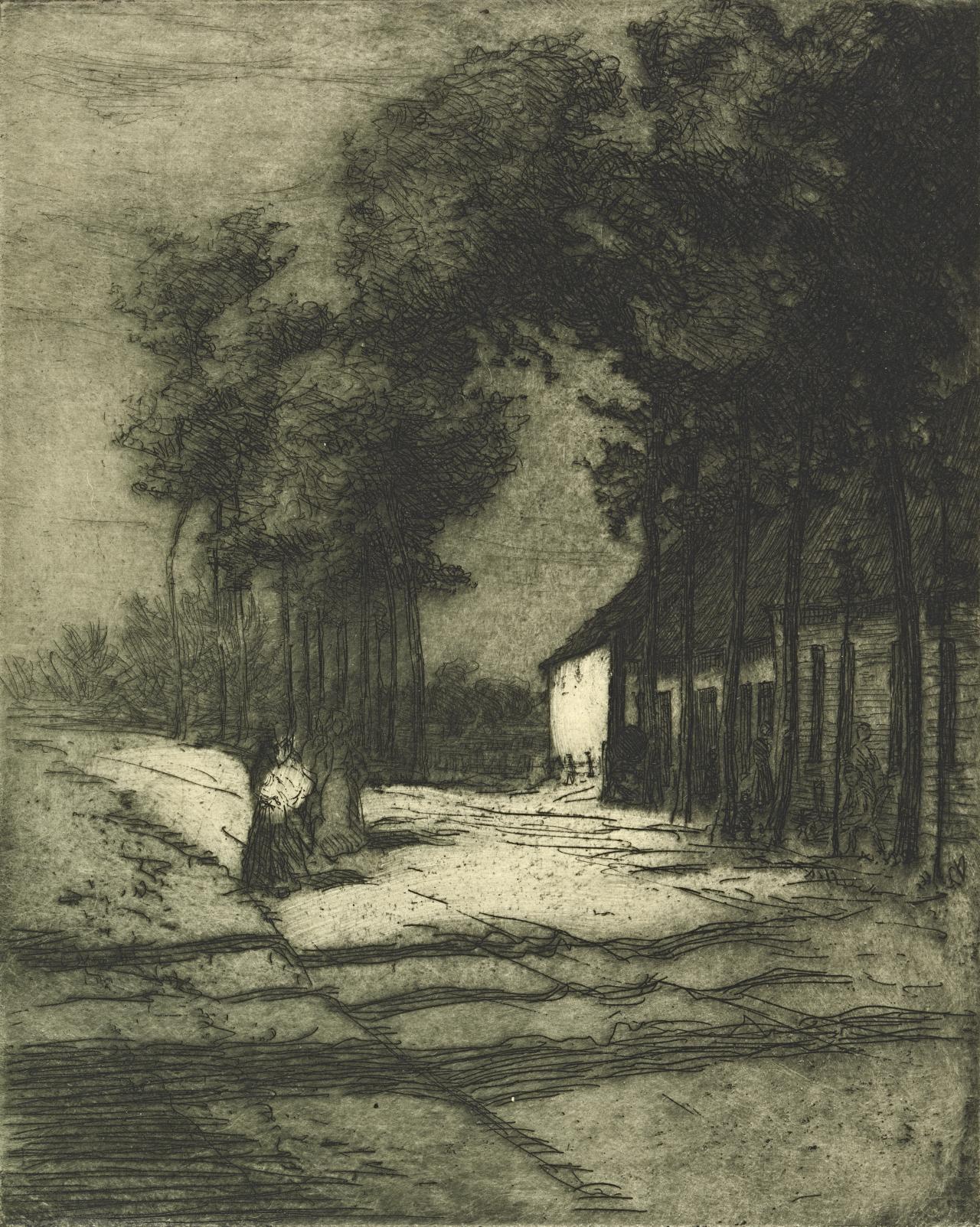 Brangwyn inked the plate with a gentle, even grey tone throughout, reserving nevertheless plenty of ink for the cross-hatching in the trees, roofs, and the crude foreground shadows. Then he wiped quite clean the wall of a building near the centre of the composition, together with a patch of contiguous roadway and a bundle carried by one of Traill’s rudimentary figures. By this means he created a strong focal point in the composition, a dramatic device often urged upon his students and employed in his own prints.38Brangwyn, Brangwyn, p. 105. Evidently pupil and teacher discussed the result, for two faults were rectified in the next state.39Mitchell Library, State Library of New South Wales. It is titled, signed, and dated 1907 in pencil. The too-distantly spaced lines were closed up, and bareness of the plate in the region of the sky was eliminated by the addition of cloud. The result was a significant change in mood of the print, which had now become restless. Interestingly, Traill avoided both the retroussage in the deeper lines, and the spotlight effect in the centre of the composition in the second attempt, preferring that her forms retain a more transparent, ephemeral character and the atmosphere remain grey and nebulous.