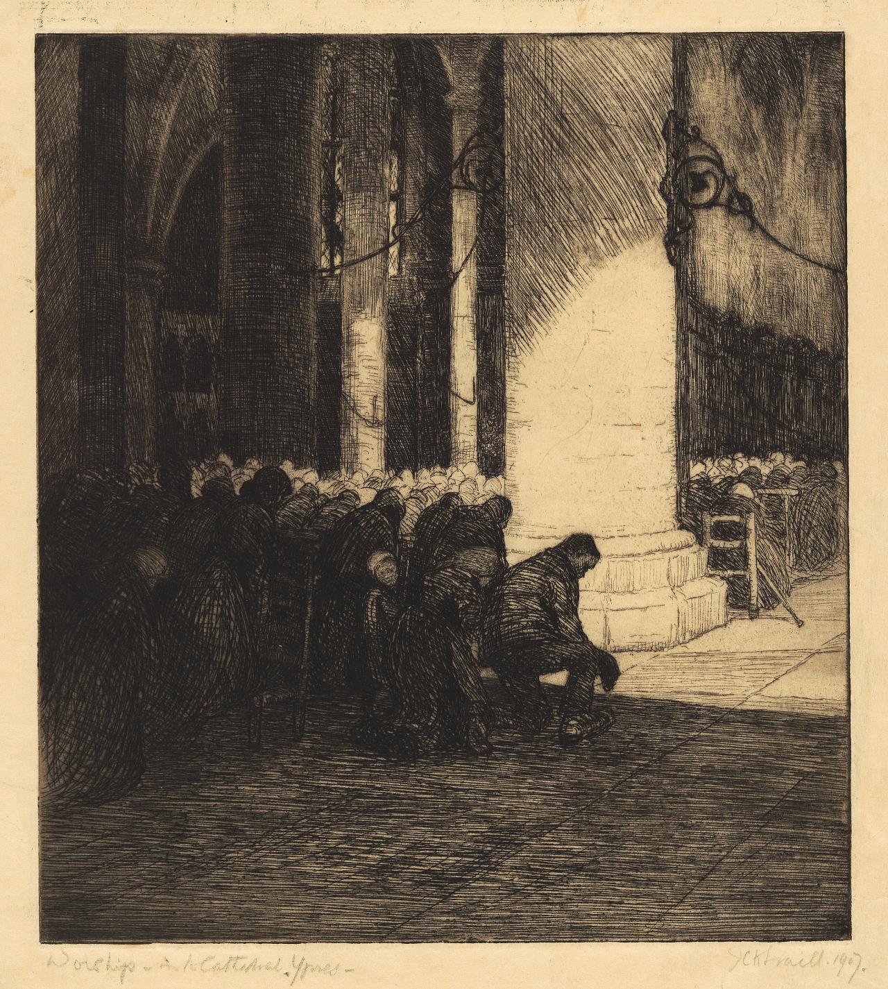 During the summer Brangwyn had taken some of his students into the church of St Martin in Ypres to sketch the congregation at prayer beneath the towering Gothic columns and arches.40St Martin was the cathedral of Ypres, destroyed in 1914. Afterwards he showed Traill how to make a composition in which the black shadows swathing the figures and deeper recesses formed a counterpoint to the bands of illumination on the pillars. Her etching Worship in the cathedral, Ypres 1907 (fig. 3) followed this advice closely, and retained the strong spotlight effect which had been less to her liking in The roadside, Flanders.41Private collection, Victoria. Brangwyn gave Traill his demonstration sketch as a token of his approval. Worship in the cathedral, Ypres is inspired not only by her teacher, but by the French realism which made a strong impact on Brangwyn’s own work.