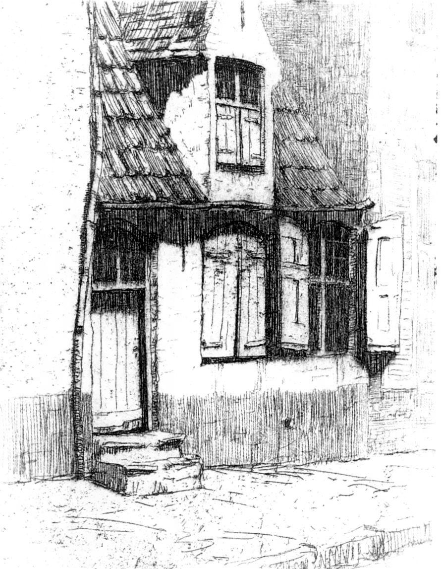 The third of the etchings printed by Brangwyn during Traill’s stay in London was titled An old house, Furnes c.1908–09 (fig. 6). Attracted to the picturesque quality of the quaint dwellings at dusk when shadows create satisfying patterns around doorways and windows, Traill saw potential for an etching which combined the frontality and simplicity of Whistler’s Venetian housefronts, or his etching The yellow house, with the heavy-handed chiaroscuro of Brangwyn. Again he has wiped a clear patch at the centre of the overall grey tone covering the plate. There is also, in Traill’s plate, more than a touch of the romantic mysteriousness achieved by the French etcher Charles Meryon in such etchings as Rue des Mauvais Garçons.