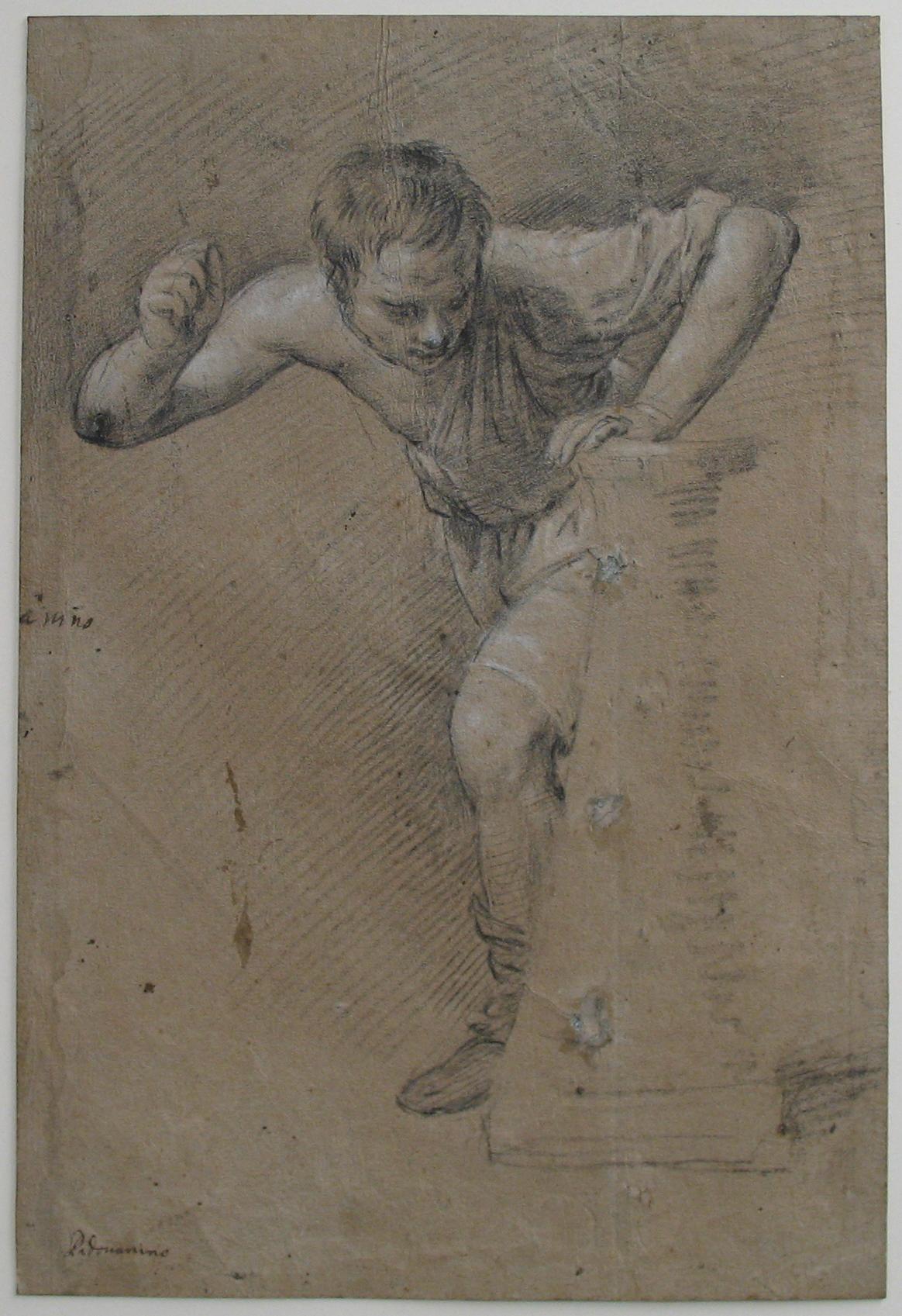 54 Alessandro Varotari, called ‘il Padovanino’, Study of a stooping shepherd boy, drawing, black chalk heightened with white, 36.5 x 26.1 cm, on blue paper mostly discoloured to a dull buff; old attribution in brown ink, lower right; ‘Padovanino’, part of an old attribution, centre right, ‘Padov/’ Art Gallery of New South Wales, gift of E. L. Montefiore 1883, inv. 474.