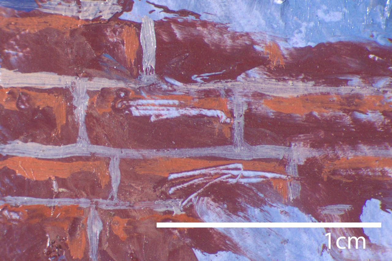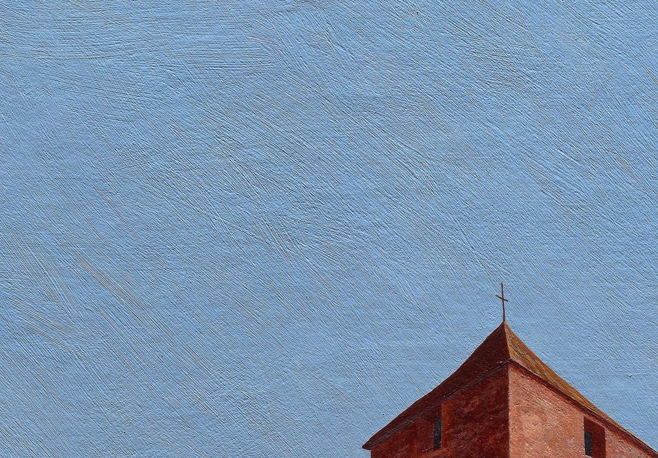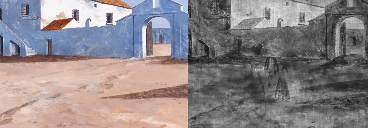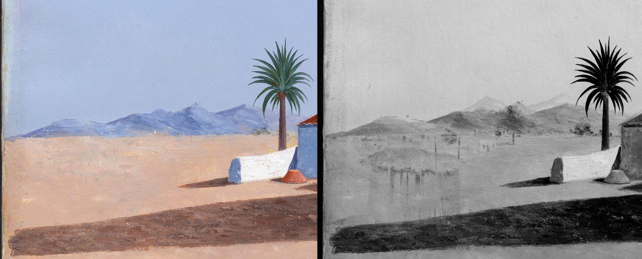 He especially loved the translucent light found in the country’s south, which he felt was invested with ‘a dramatic quality, both noble and cruel’.6ibid. p. 139. His Spanish landscapes, like Andalusian farm, 1949, are charged with electric energy and poised in breathless and eerie suspension, displaying what critic G. S. Whittet called ‘an atmosphere of coldness and desertion that rather belies their locale’.7G. S. Whittet, ‘London commentary’, The Studio, vol. 141, no. 695, February 1951, p. 61. The surreal stillness of Hillier’s Spanish paintings stems in part from the artist’s meticulous working methods. While based on sketches drawn from life, his landscapes were created in the studio; typically, up to six different preparatory grounds were painted onto each canvas before Hillier commenced work on a subject, the underlying layers being repeatedly sanded back and dried over a six-month period. After applying a final ground, which was tinted a warm grey or flesh tone, he drew in the composition completely with a sable brush and white paint diluted with turpentine. Finally, the colour was applied; again he used sable to achieve his characteristically polished surfaces in which there are few discernible brushstrokes.8For a description by Hillier of his methods, see Usherwood, p. 17.