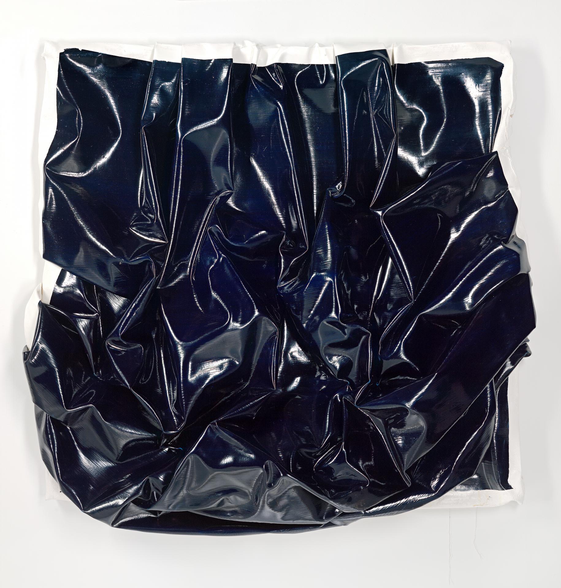 Fashion, the body and disease are also relevant to understanding works such as Loose fit (Blue) which ‘wears’ the canvas as if it were oversized clothes. The painting is part of a series of Loose fit canvases that have been removed from their stretchers and screwed up. The transformative qualities of the grotesque and its symbolic associations with bodily discharge, eroticism, transgression and excess reiterates the artist’s aesthetic interest in the imperfect and risqué. Conceptually Loose fit (Blue) explores the body that smells, is sensual and subject to change. The creases in the canvas reference saggy folds in the skin like those bodily after-effects of a crash diet or giving birth. De la Cruz says, ‘If I do something beautiful I can’t breathe. I get claustrophobic. I want it to be physical, brutal’.