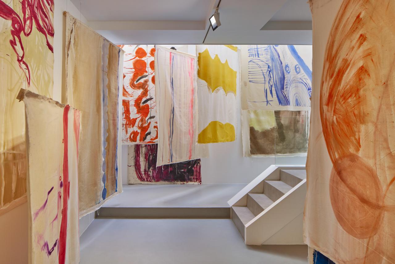 Argentinian-Swiss artist Vivian Suter’s contribution to the NGV Triennial 2023 is suspended individual canvases that not only evoke the wonder of a maze-like forest to be meandered through, but also allude to the layered and immersive tropical environment that has directly contributed to the vividly coloured and gesturally marked canvases. For more than four decades Suter has been welcoming the imprint of nature into her work. The artist routinely works outdoors, leaving canvases outside and learning to accept the power of nature when it enters her built space. Located in a remote tropical region, situated on the slopes of a volcano on the land of an old coffee plantation surrounding Lake Atitlán in Panajachel – an adventure-filled three-hour drive from Guatemala City – the artist’s home and studio have informed her choice of materials, which include house paint, fish glue and cheap local fabric, and have shaped the way she thinks, lives and creates with nature.