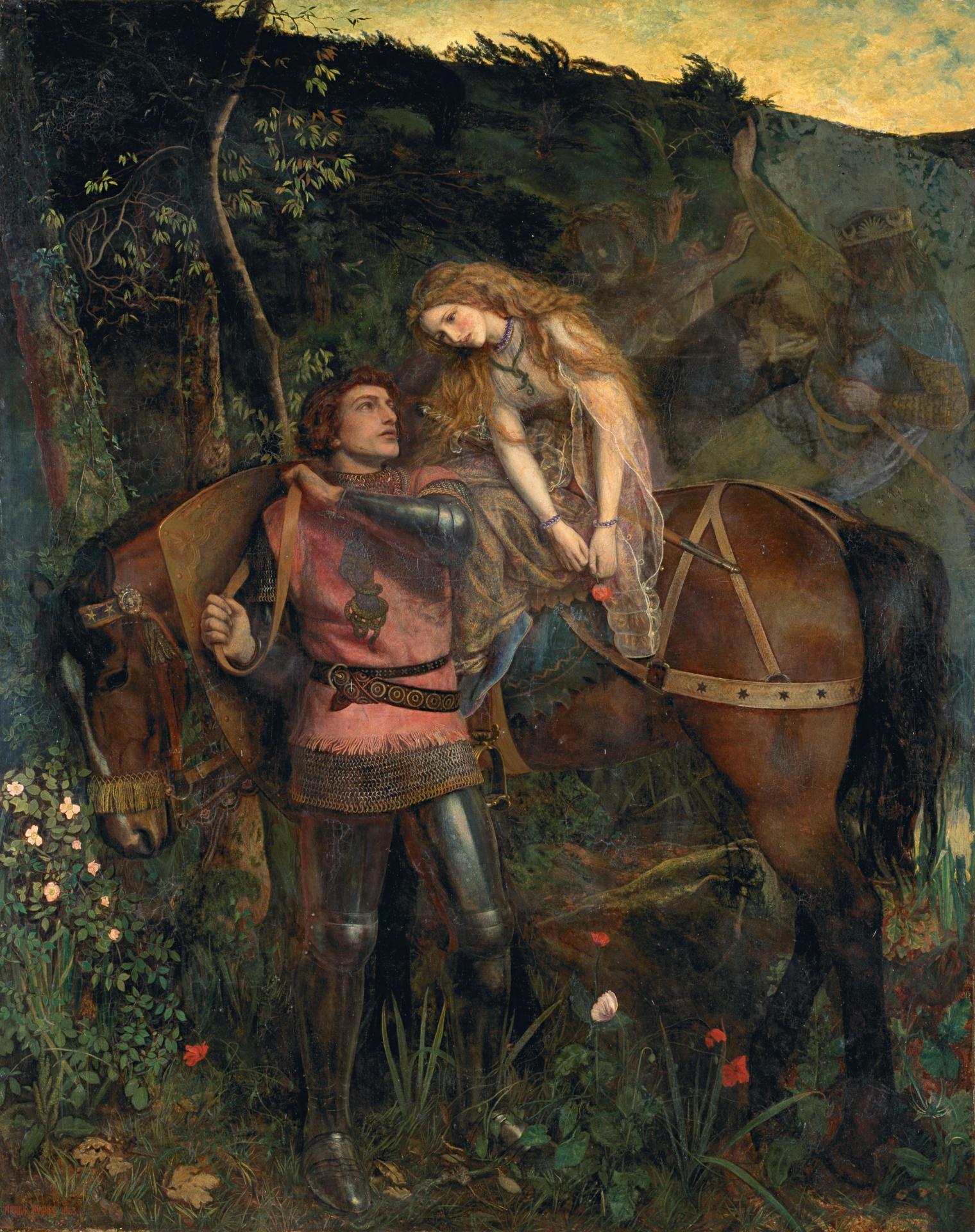 Hughes’s image refers to the first line in particular. At the same time the painting attempts to go beyond this single moment by the suggestion of the aftermath of the knight’s encounter with the lady. Like all Victorian narrative paintings La Belle Dame sans merci aspires to the condition of cinema, seeking to extend the temporal dimensions of the single image. Thus the picture introduces the pale kings, princes and warriors who subsequently visit the knight in a dream and warn him of this thraldom to the belle dame.