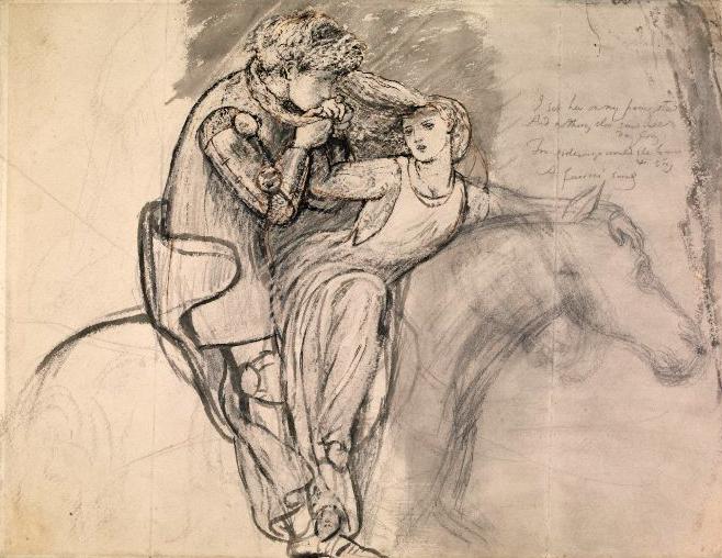 Arthur Hughes’s La Belle Dame sans merci was painted five years before Lady Lilith, and therefore just precedes the emergence of the fully-fledged fatal woman. How then does the painting engage with its subject? Hughes’s painting follows his earlier sketches (figs 3, 8) and Rossetti’s drawing (fig. 2) in illustrating the sixth stanza of the ballad: