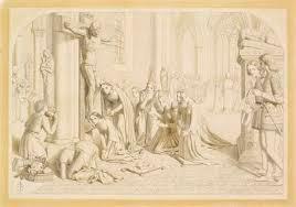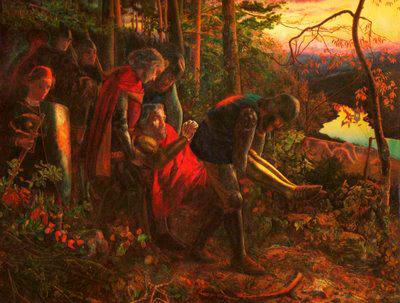 In 1860 Hughes exhibited his Arthurian The knight in the sun at the Royal Academy: La Belle Dame sans merci can be seen as a companion to this work. Thomas Plint, who commissioned La Belle sans merci, had been the purchaser of the earlier work. Both were large paintings with knightly themes and similar sunset/twilight settings. The knight in the sun illustrates the legend of a knight who, at the end of a Christian life, was carried out of his castle to see the setting sun whose badge he wore.19 ibid., p. 452.