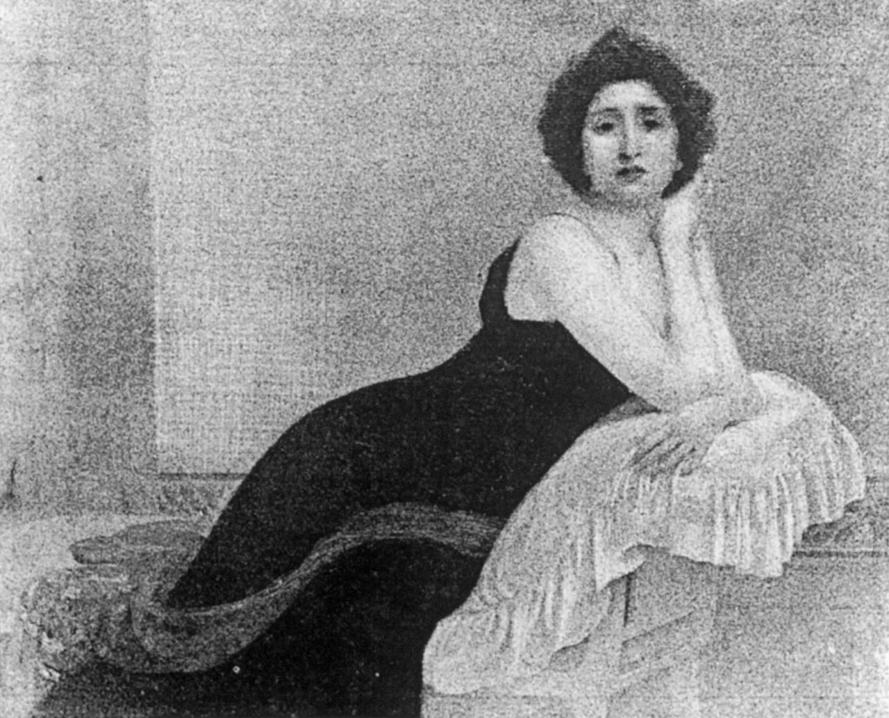 Deslandes’s participation in posed self-images can be compared to the determined self-promotion of her contemporary, the famous actress Sarah Bernhardt. In a similar fashion to Deslandes, Bernhardt was an expert in the creation and control of her celebrity status, commissioning numerous painters, photographers and sculptors to represent her likeness.29 See Meri Llawen Machin-Roberts, ‘Dramatic publicity: portraiture as creative collaboration: Sarah Bernhardt, Nellie Melba and Bertram Mackennal’, MA thesis, University of Melbourne, 2004, pp. 2, 67. Interestingly, Bernhardt also incorporated the bat motif in some of her self-consciously composed images by wearing a ‘bat hat’ that was possibly inspired by her friendship with Montesquiou.30 Bergman-Carton, pp. 116, 200–1, n. 19. A significant example of Bernhardt ’s constructed self-images is the Portrait of Sarah Bernhardt, 1876, by Georges Jules Victor Clairin.31 This portrait of Bernhardt was placed on display at the 1876 Salon, where it received both positive and negative reviews. See Heather McPherson, The Modern Portrait in Nineteenth-Century France, Cambridge University Press, Cambridge, 2001, p. 109. Dressed in white, Bernhardt lounges on a deep-red velvet divan with a slender wolfhound at her feet. The work emphasises the actress’s unmistakably thin physique, her chic yet racy corsetless gown, as well as her passionate love for wild animals, feathers and fur.32 See Carol Ockman, ‘Was she magnificent? Sarah Bernhardt’s reach’, in Ockman et al., pp. 28–9. Deslandes similarly shared a desire for the promotion of her fame and reputation through visual imagery, as evidenced by her portraits and photographs. Consequently, she can be seen to fit the contemporary mould of a female celebrity in high society or the dramatic arts, utilising self-images in order to achieve her desire for widespread recognition.